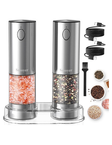 - CARGA TIPO-C Y SIN BATERÍAS: ¡No es necesario preparar baterías más! El juego de molinillos de sal y pimienta recargables viene con un cable de carga Tipo-C para una carga rápida, moliendo al menos 100ml de especias cuando está completamente cargado. Diseñado con la sostenibilidad en mente, reduce la necesidad de baterías desechables y promueve una experiencia de molienda más ecológica.