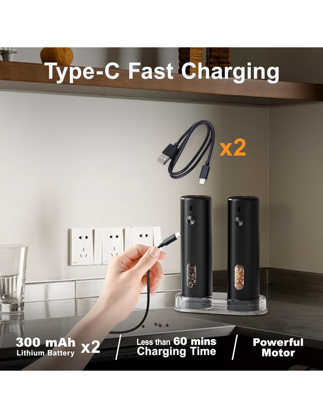 Equipado con dos cables USB. Recarga sin esfuerzo el molinillo automático de sal y pimienta en cualquier momento y lugar. Una carga completa toma menos de una hora, eliminando la necesidad de reemplazos frecuentes de baterías y garantizando un uso ininterrumpido.