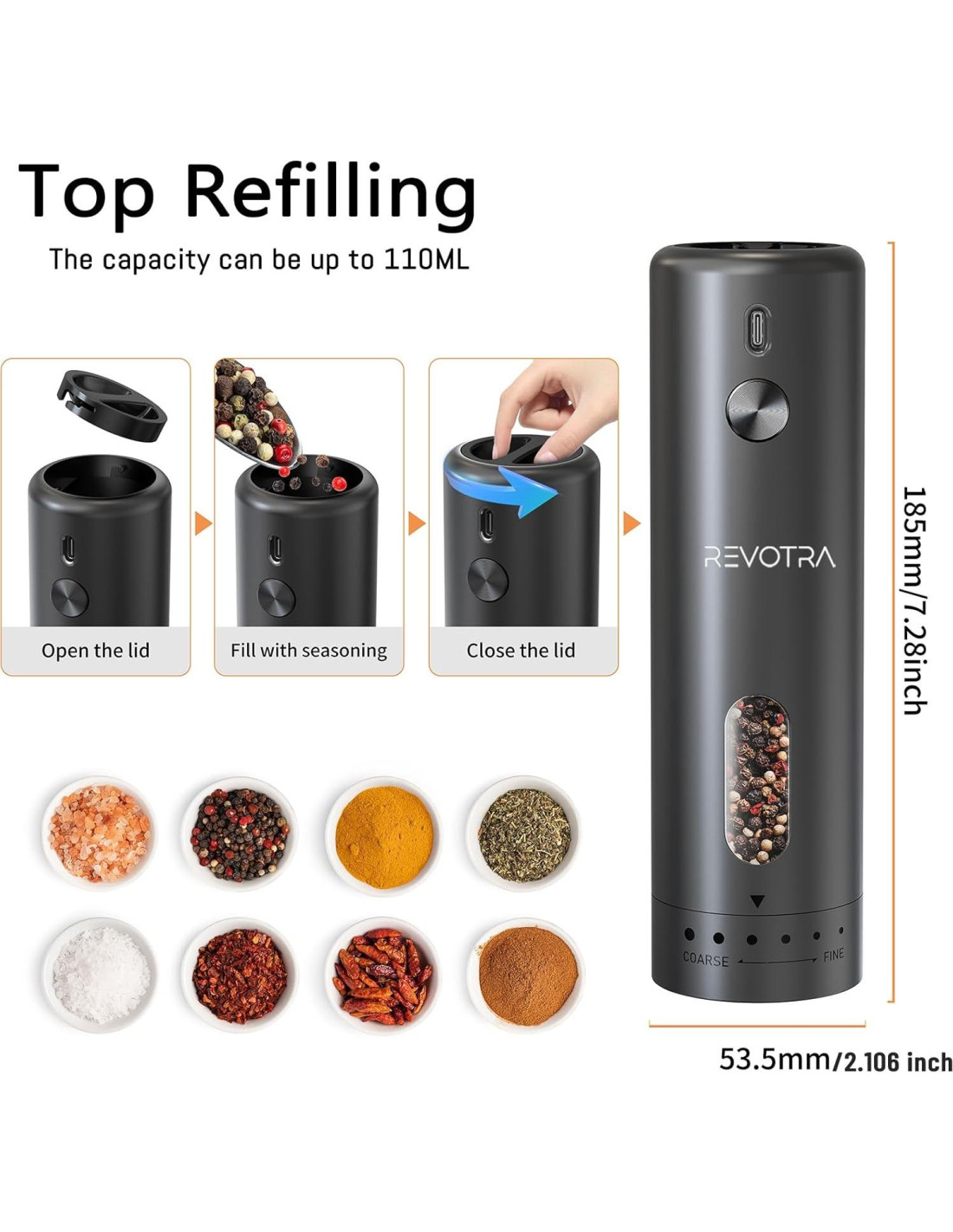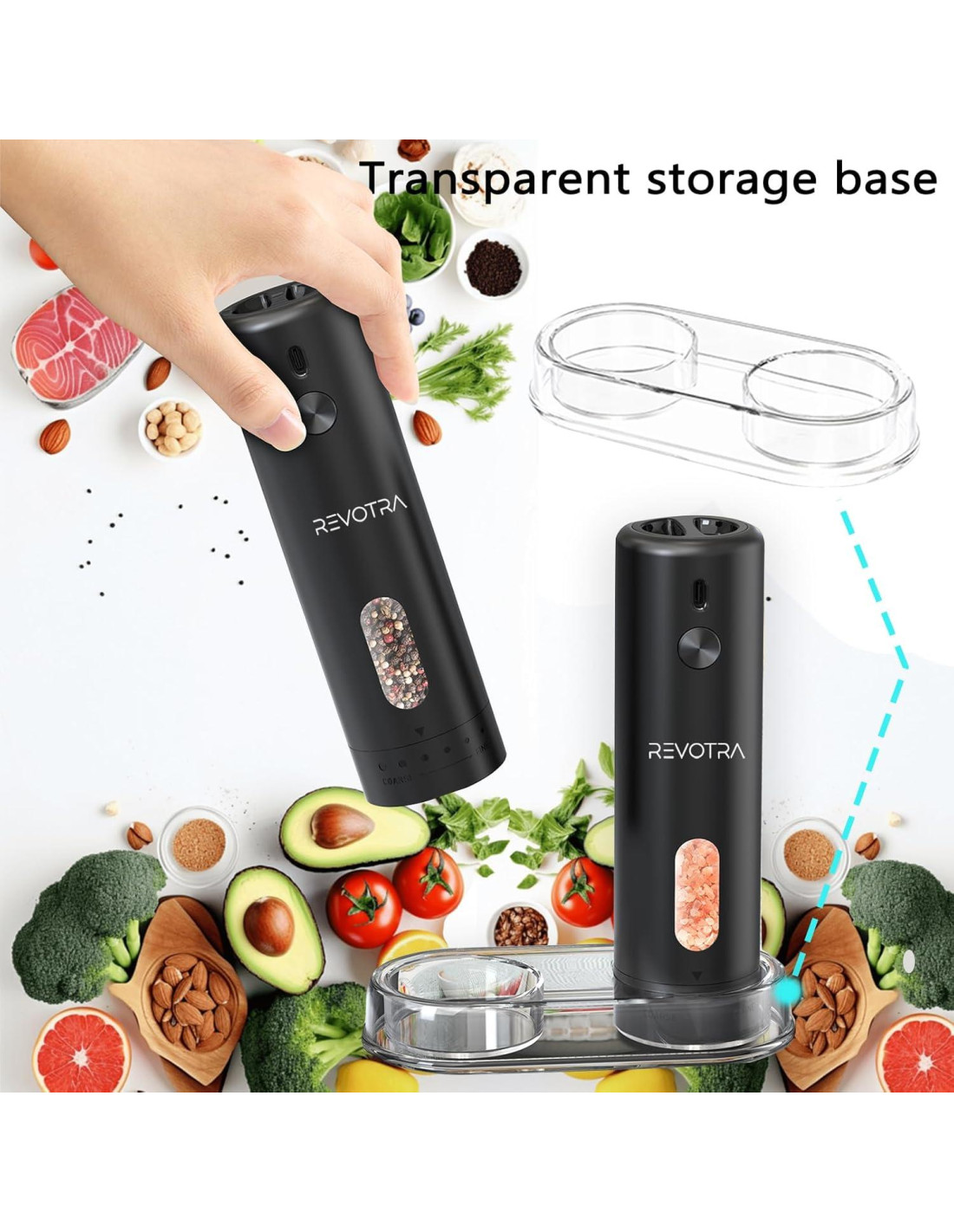 - Duradero y de Alta Capacidad: El juego de molinillos de sal y pimienta eléctricos es de alta calidad y duradero. Adopta material ABS de grado alimenticio para construir el contenedor de especias, que es lo suficientemente grande para contener 110 ml de especias. El diseño de ventana transparente es conveniente para verificar la cantidad restante, la estructura de boca ancha es fácil de reabastecer el condimento. También viene con una base de almacenamiento transparente para evitar volcaduras y asegurar un fácil almacenamiento.