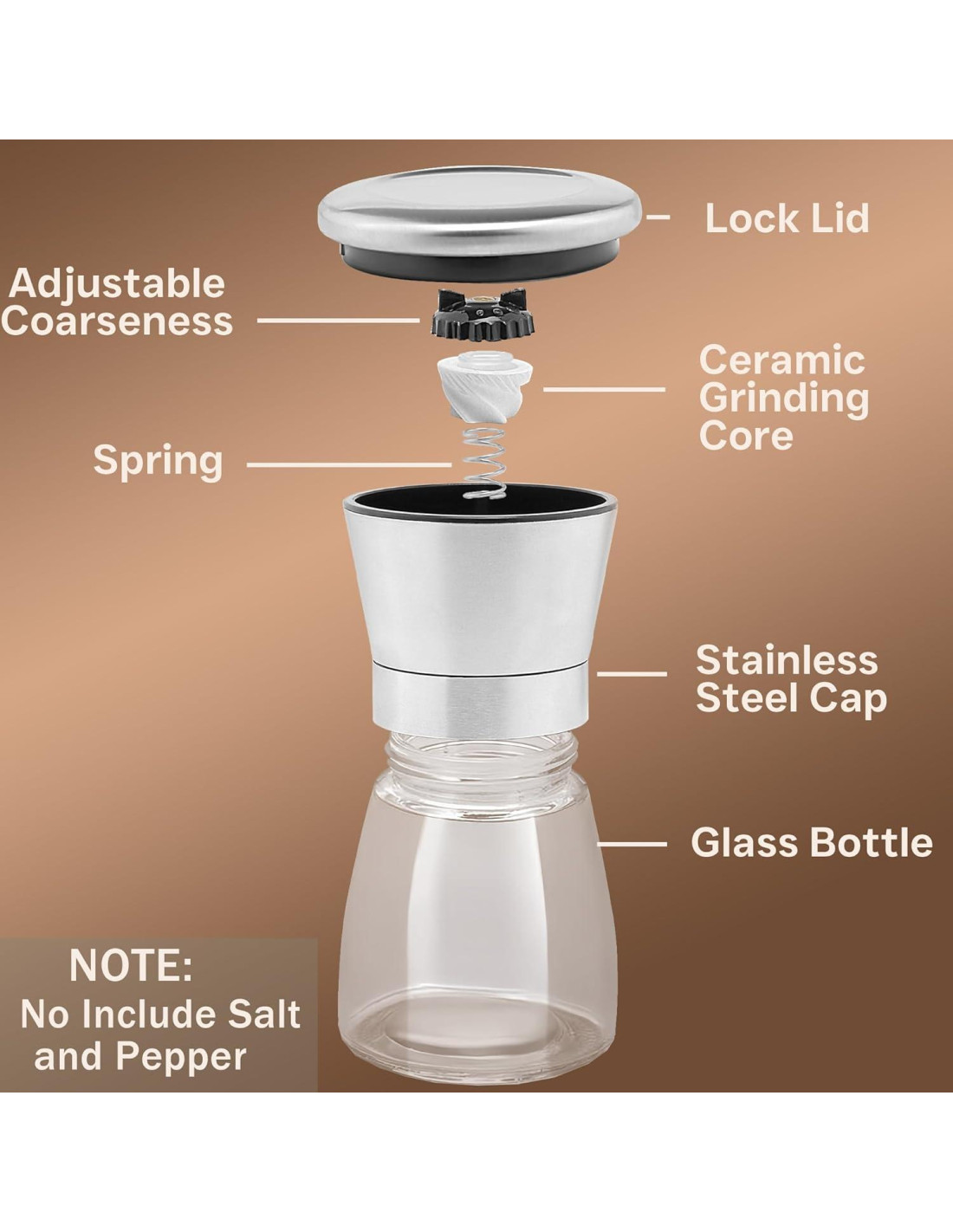 - [Calidad Premium] El juego de molinillos de sal y pimienta M JINGMEI está fabricado con vidrio libre de BPA, con una tapa de acero inoxidable cepillado resistente a la corrosión y un núcleo de molienda de cerámica duradero. Este juego de molinillos recargables, que incluye tanto molinillos de sal como de pimienta, está diseñado para durar y es la adición perfecta a tu cocina (Nota: Sal y pimienta no incluidas).