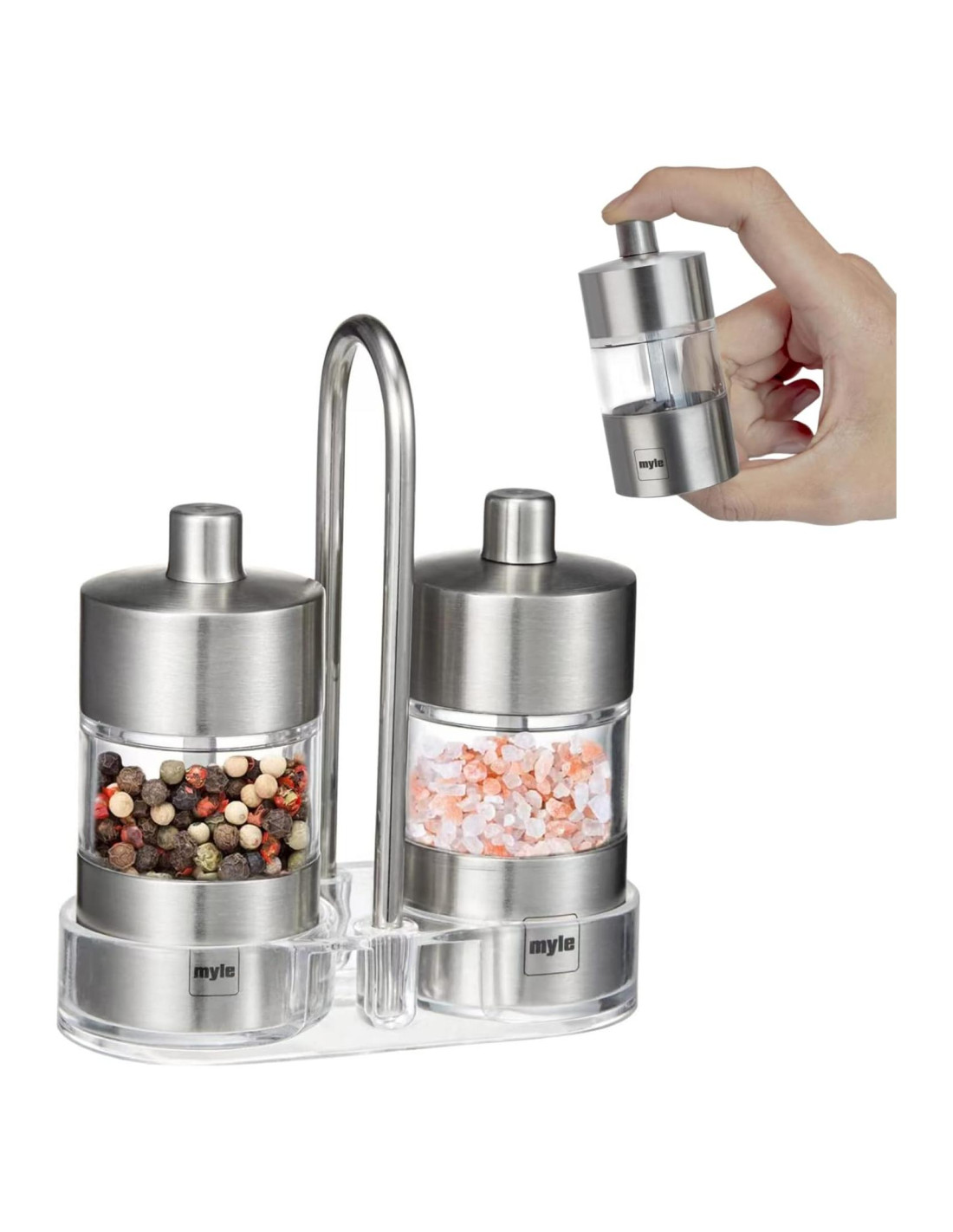 - [SOPORTE ÚNICO] El pequeño juego de molinillos de sal y pimienta tiene un soporte hecho de acrílico y acero inoxidable. Con él, el molinillo de pimienta se puede almacenar de manera más ordenada y el molinillo se puede mover fácilmente cuando sea necesario. La base de acrílico protege las encimeras de mármol o madera de rasguños de los molinillos de acero inoxidable.