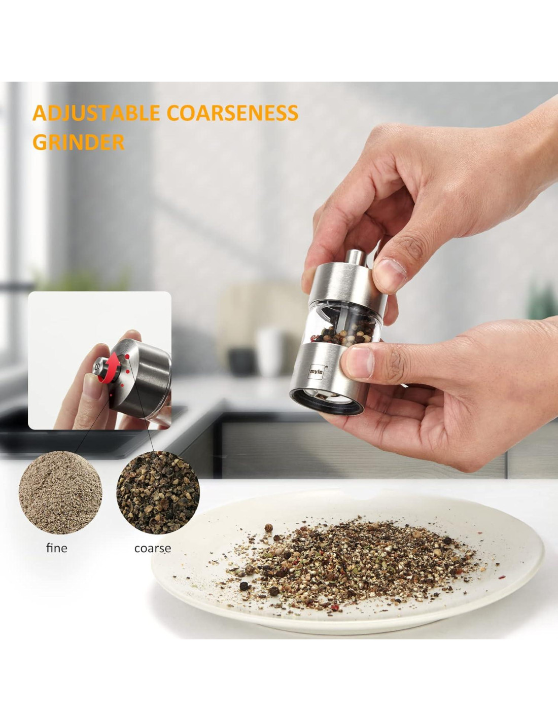 - [CALIDAD PREMIUM] Este pequeño juego de molinillos de sal y pimienta está hecho de acero inoxidable y acrílico de grado alimenticio. No cambia de color ni se deforma cerca de altas temperaturas. El núcleo de molienda de cerámica está diseñado para moler especias como la sal marina que es vulnerable a la humedad, lo que garantiza durabilidad y resistencia a la corrosión.