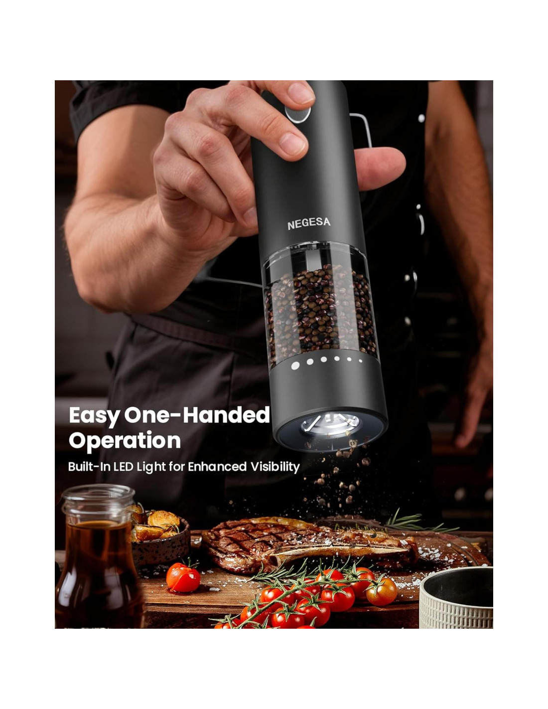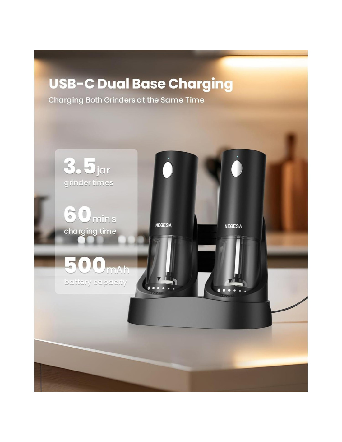 - Base de Carga USB Conveniente: ¡Di adiós a las baterías desechables! Nuestro juego de molinillos eléctricos cuenta con un elegante muelle de carga que alimenta ambos molinillos simultáneamente a través de USB. Simplemente colócalos en la base (alineados con los puertos de carga) para una carga rápida y ecológica, perfecta para cocinas y uso al aire libre.