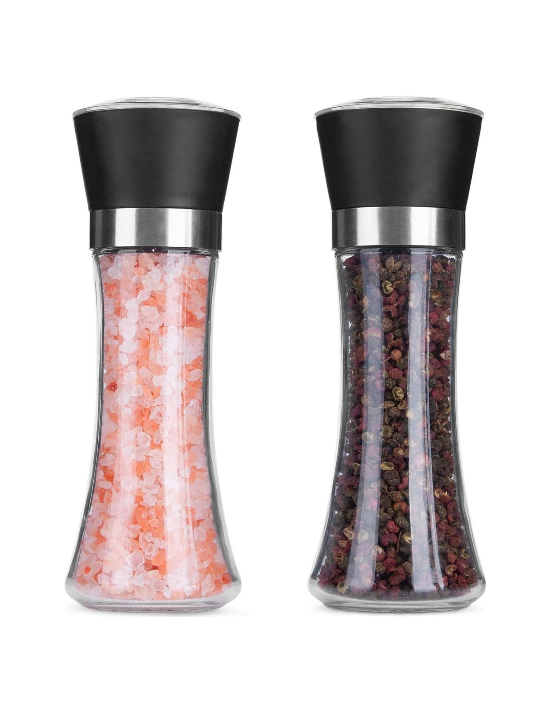 - Juego de Molinillos de Sal y Pimienta de Vidrio y Acero Inoxidable de Alta Calidad: Estos molinillos de sal y pimienta están construidos con un diseño elegante y claro de vidrio duradero para su cocina o fiesta de cena. ¡Gran regalo o recuerdo de fiesta! La tapa de plástico reduce el peso y facilita su uso. *Sal y pimienta no incluidas.