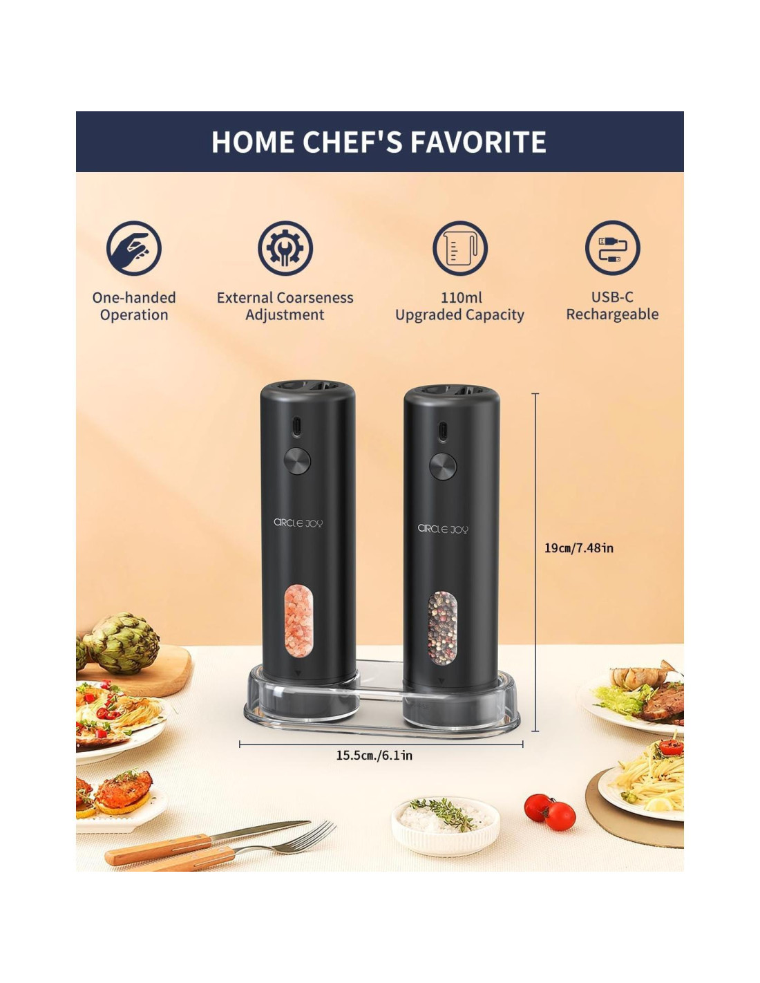 - CAPACIDAD GENEROSA PARA MENOS RECARGAS - Con una impresionante capacidad de 110ml, estos molinillos de pimienta eléctricos sostienen cantidades amplias de tus especias favoritas, minimizando la necesidad de recargas constantes. Perfectos tanto para la preparación de comidas diarias como para reuniones más grandes, aseguran que tengas suficiente sazonador a mano sin interrumpir tu flujo de cocina