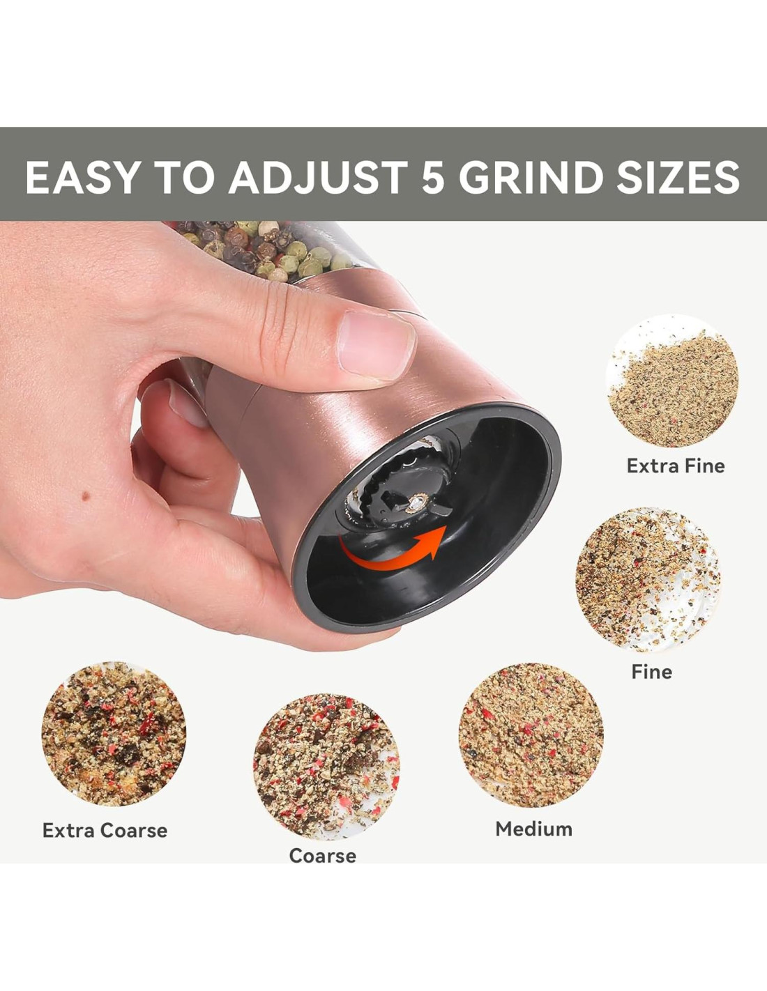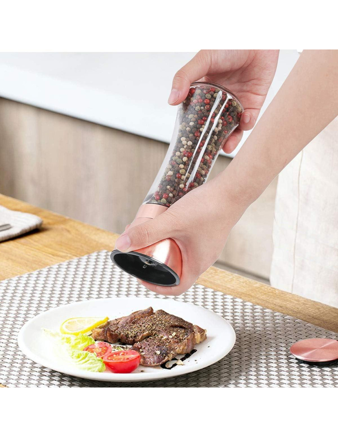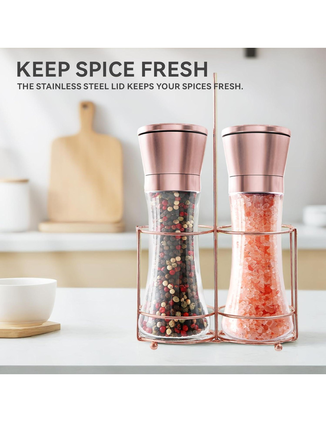 - [Juego de Molinillos de Sal y Pimienta de Cobre Premium (2-Pack)] Mejora tu cocina con estos elegantes molinillos de acero inoxidable con revestimiento de cobre y vidrio duradero. El diseño de vidrio transparente te permite ver fácilmente cuándo es el momento de rellenar. Capacidad de hasta 3/4 taza de especias. (Sal y pimienta no incluidas en el set.)