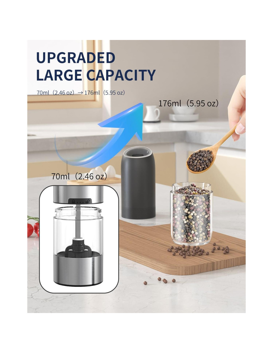 - Molienda Inteligente con Sensor de Gravedad - Experimenta una operación sin esfuerzo con una mano gracias a la tecnología de sensor de gravedad inteligente. Simplemente inclina el molinillo eléctrico de pimienta sobre tu plato y comenzará a moler automáticamente, eliminando la necesidad de botones o giros manuales. Perfecto para chefs ocupados o aquellos con fuerza de agarre limitada, esta característica asegura un control preciso y un sazonado fresco cada vez.