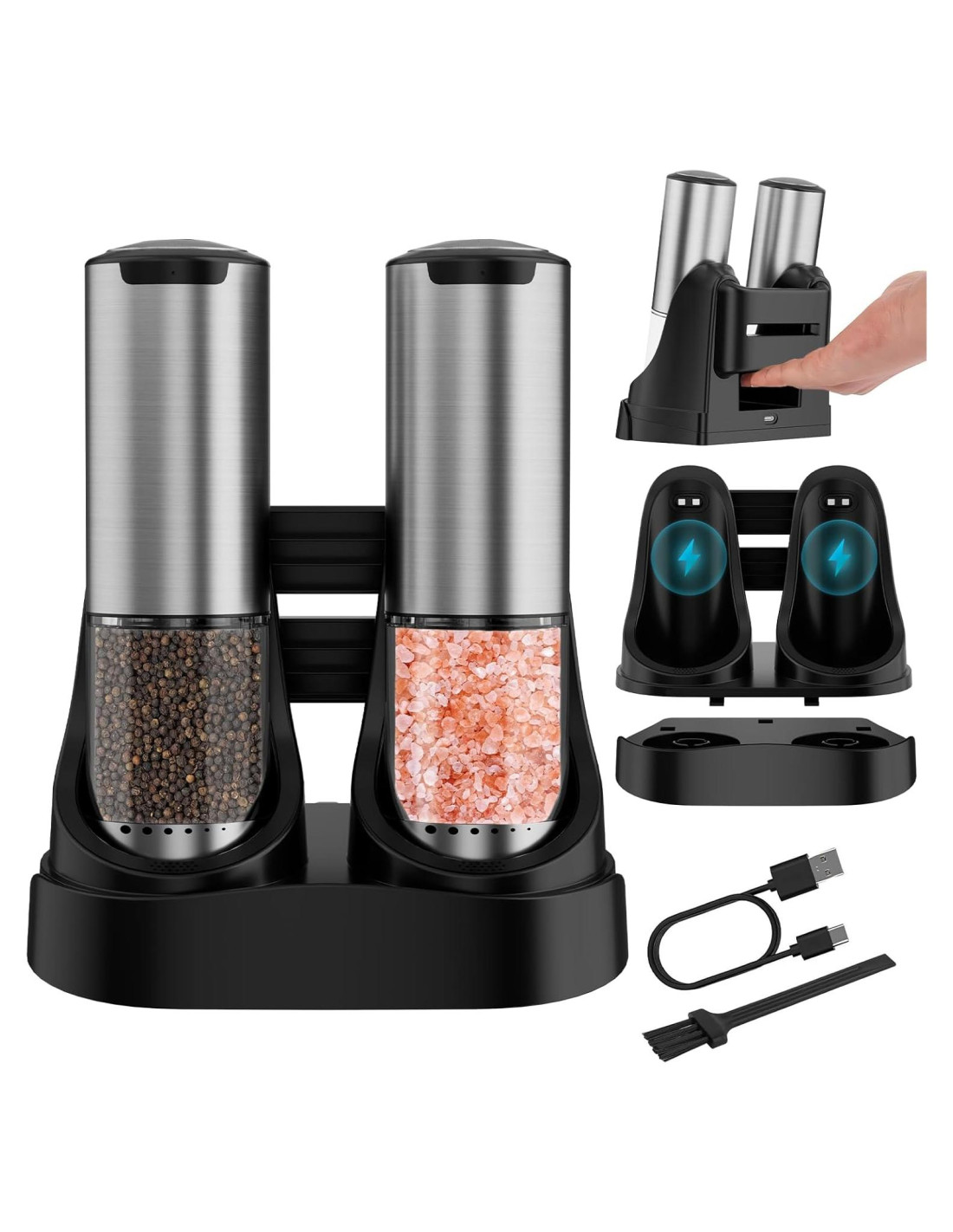 - Contenido del Paquete: El juego incluye 2 molinillos, 1 base de carga, 1 cable de carga tipo-c, 1 cepillo y 1 manual de instrucciones (Nota: la sal y la pimienta no están incluidas). Hay una ranura en la parte posterior de la base de carga, por lo que puedes llevar fácilmente todo el juego de molinillos de sal y pimienta del electrodoméstico de cocina a la mesa de comedor