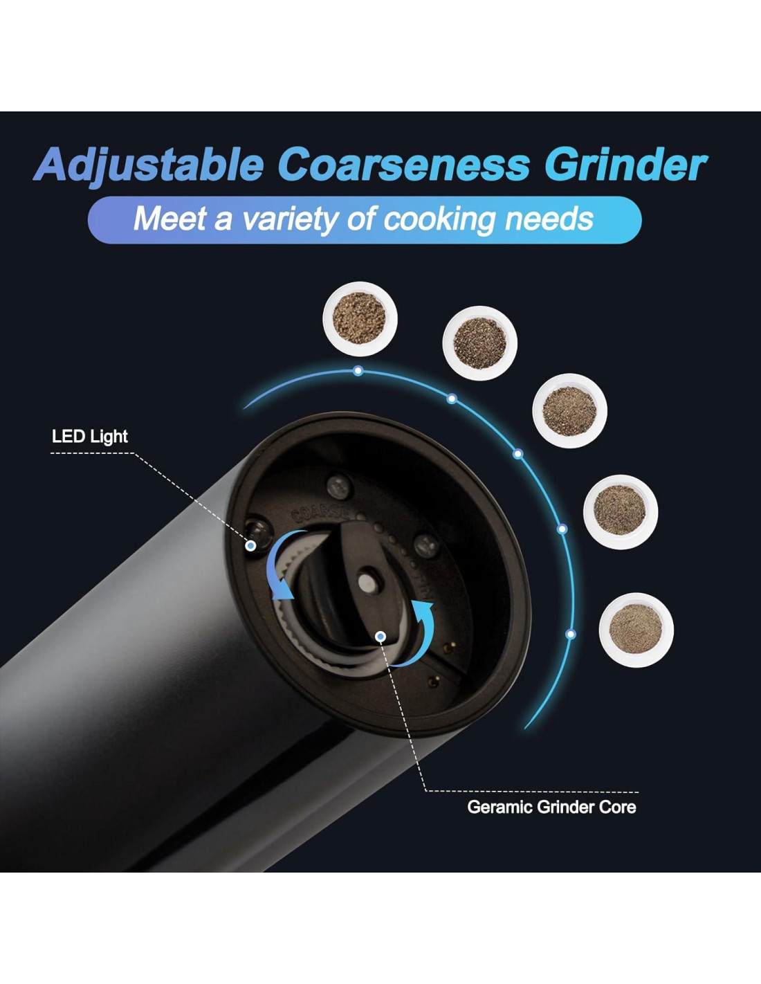 - Regalo Perfecto para Gadgets de Cocina: nuestro molinillo automático de sal y pimienta es fácil de usar; El diseño de textura mate, las brillantes luces LED blancas, la rugosidad ajustable y el diseño fácil de llenar lo convierten en un producto de primera categoría; Este molinillo eléctrico de sal y pimienta está exquisitamente empaquetado, es práctico y una gran opción para las festividades.