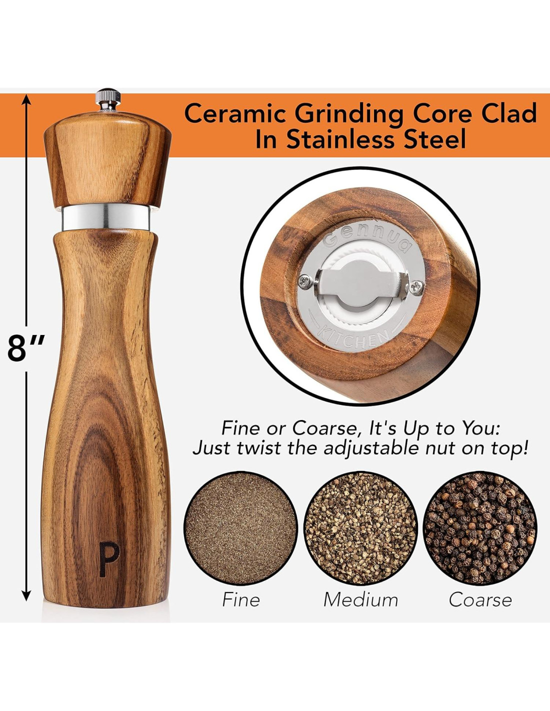 - Respaldado por tus Compañeros Gourmet: En una encuesta reciente, cocineros astutos como tú elogiaron este juego de molinillos de sal y pimienta de madera. Les encantó su hermoso grano y forma ergonómica. Creemos que a ti también te gustará.