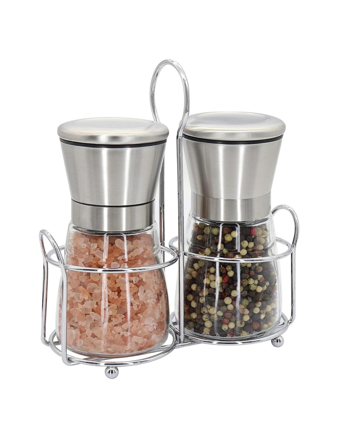 - Juego de Molinillos de Sal y Pimienta - Hecho con materiales de alta calidad: Carcasa de acero inoxidable cepillado, cuerpo de vidrio grueso y duradero y rotor de cerámica no corrosivo. El diseño elegante y estiloso se adapta perfectamente a tu cocina y mesa de comedor. Además, proporcionamos un soporte de acero inoxidable adicional para que coloques los molinillos de especias - Fácil de llevar, sin más desorden en tu mesa. *Sal y pimienta no incluidos.
