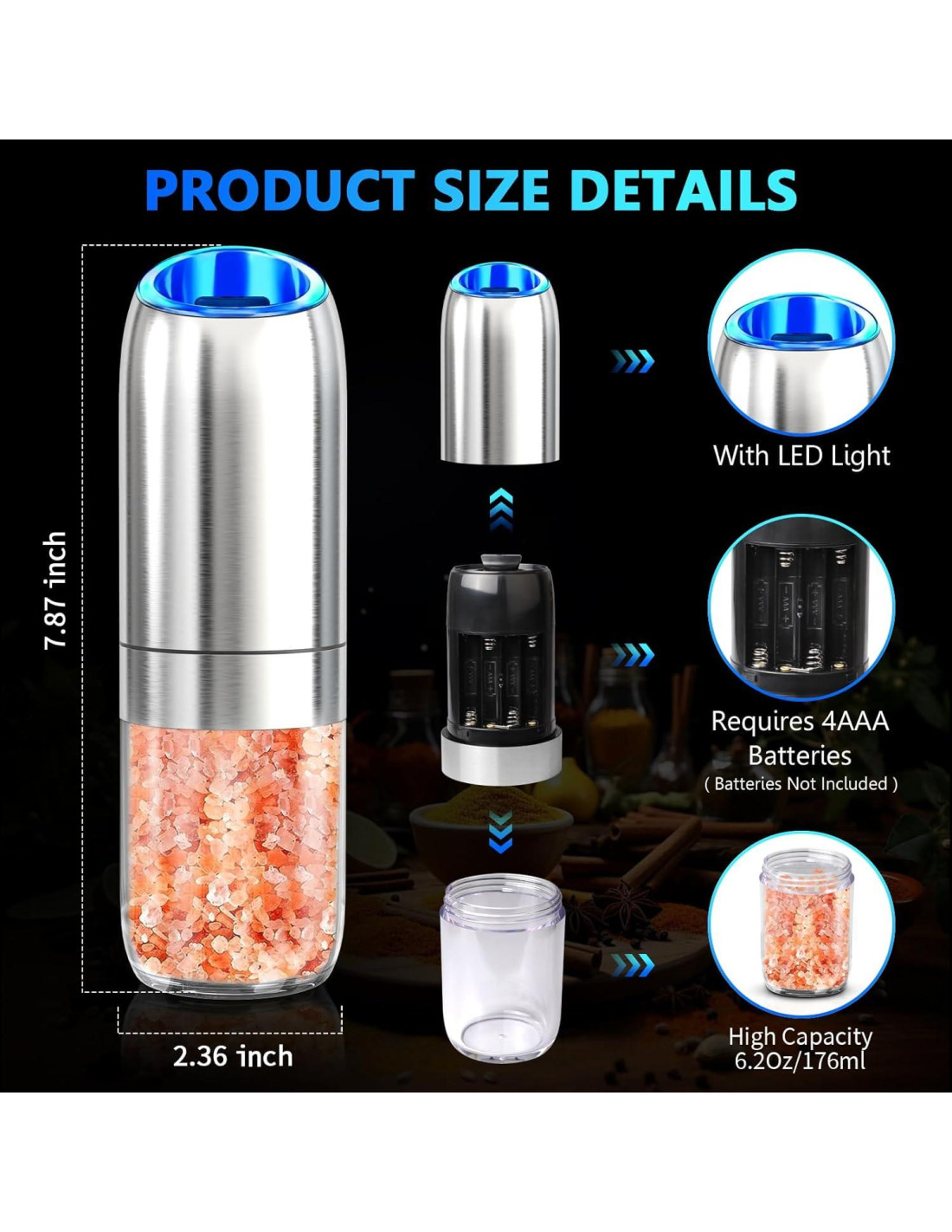 - [Conjunto de Molinillos de Sal y Pimienta Automáticos de Acero Inoxidable y Bajo Ruido] El Conjunto de Molinillos de Sal y Pimienta Eléctricos Boan, Acero Inoxidable Mejorado, Rotor de Cerámica y Motor de Reducción de Ruido, 4 Baterías (No Incluidas), 33% Más Larga Vida de Batería, Conjunto de Molinillos de Sal y Pimienta a Batería con Silencio de Nivel de Biblioteca (<45db), Bueno para Cocinar Tarde en la Noche, Usa Saleros para Cocina Elegantes y Molinillos de Sal Sin Despertar a Tu Familia, Imprescindibles para Nueva Casa.