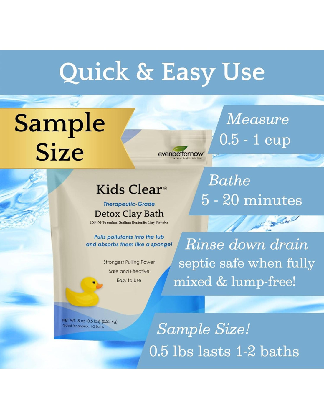 - ¿Buscas una forma natural y efectiva de apoyar el bienestar de tu hijo? El Baño de Arcilla Detox Claro para Niños es una arcilla de bentonita 100% pura y natural con excepcionales propiedades de carga superficial iónica (CEC de 98-107 meq/100g) para una máxima absorción y adsorción cuando se mezcla con agua tibia. Este Tamaño de Muestra (0.23 kg) es la manera perfecta de probar nuestro producto o compartirlo como un regalo considerado.
