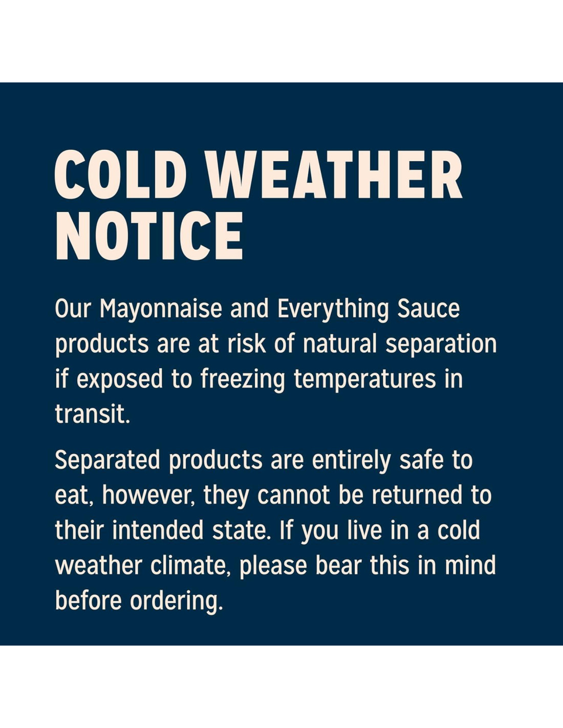 - ADVERTENCIA DE CLIMAS FRÍOS: Durante el invierno, los condimentos pueden congelarse durante el transporte. Si bien son seguros para comer, no se verán ni sabrán bien. Puede que desees retrasar tu pedido hasta que las temperaturas sean más cálidas.