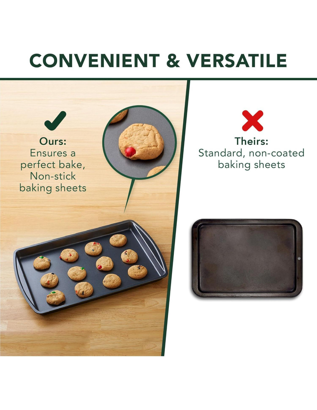- JUEGO DE UTENSILIOS DE COCINA: Estas bandejas duraderas están hechas para soportar toda su diversión al hornear o cocinar algo para la cena. Pueden resistir hasta 232 grados Celsius en el horno para que todos sus dulces estén exactamente como a usted le gustan.