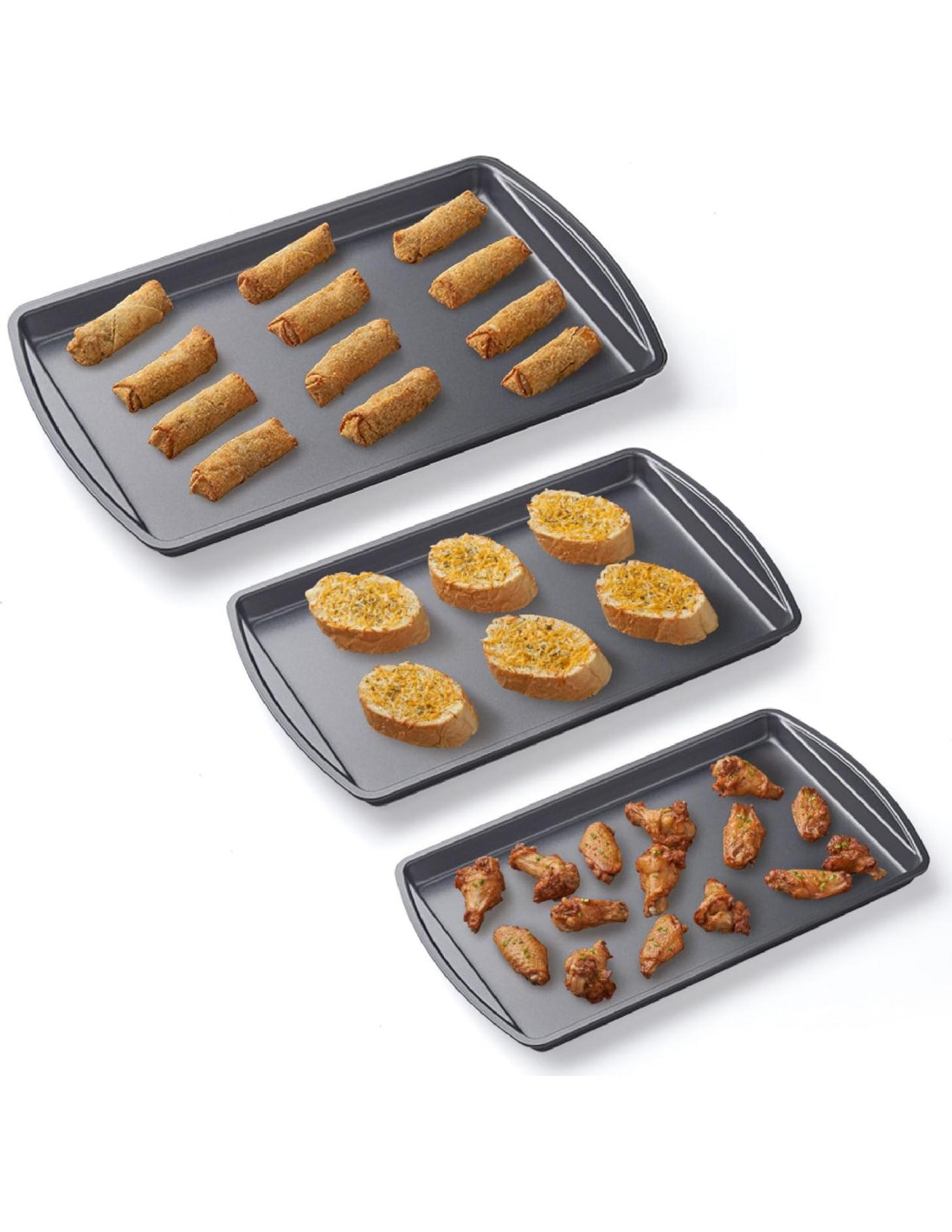 - DIMENSIONES: Este juego de utensilios para hornear viene con tres bandejas de acero al carbono de varios tamaños para estar preparado para todos sus trabajos de horneado. La grande mide 43.2 cm x 29.2 cm, la mediana mide 36.8 cm x 25.4 cm, y la pequeña mide 33.7 cm x 21.6 cm.