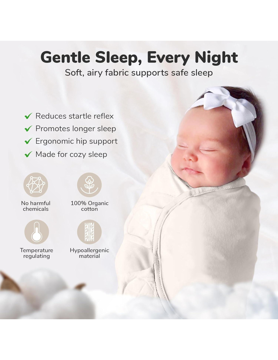 - SACO DE SUEÑO BABY SWADDLE ORGÁNICO ULTRA SUAVE- Diseñado específicamente para 0-3 Meses, este saco de envolver para bebés promueve un sueño acogedor y cómodo. Hecho de 100% algodón orgánico super suave, ofrece una experiencia suave y amigable con la piel. El diseño absorbente de sudor y transpirable de nuestra manta de envolver para la guardería previene el sobrecalentamiento, asegurando un sueño pacífico para tu pequeño. Lavable a máquina y resistente a la decoloración, esta manta de envolver para dormir es una adición vital a tus esenciales para bebés.