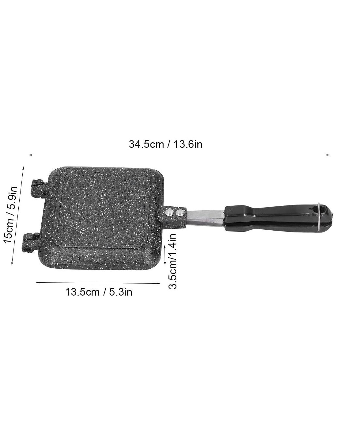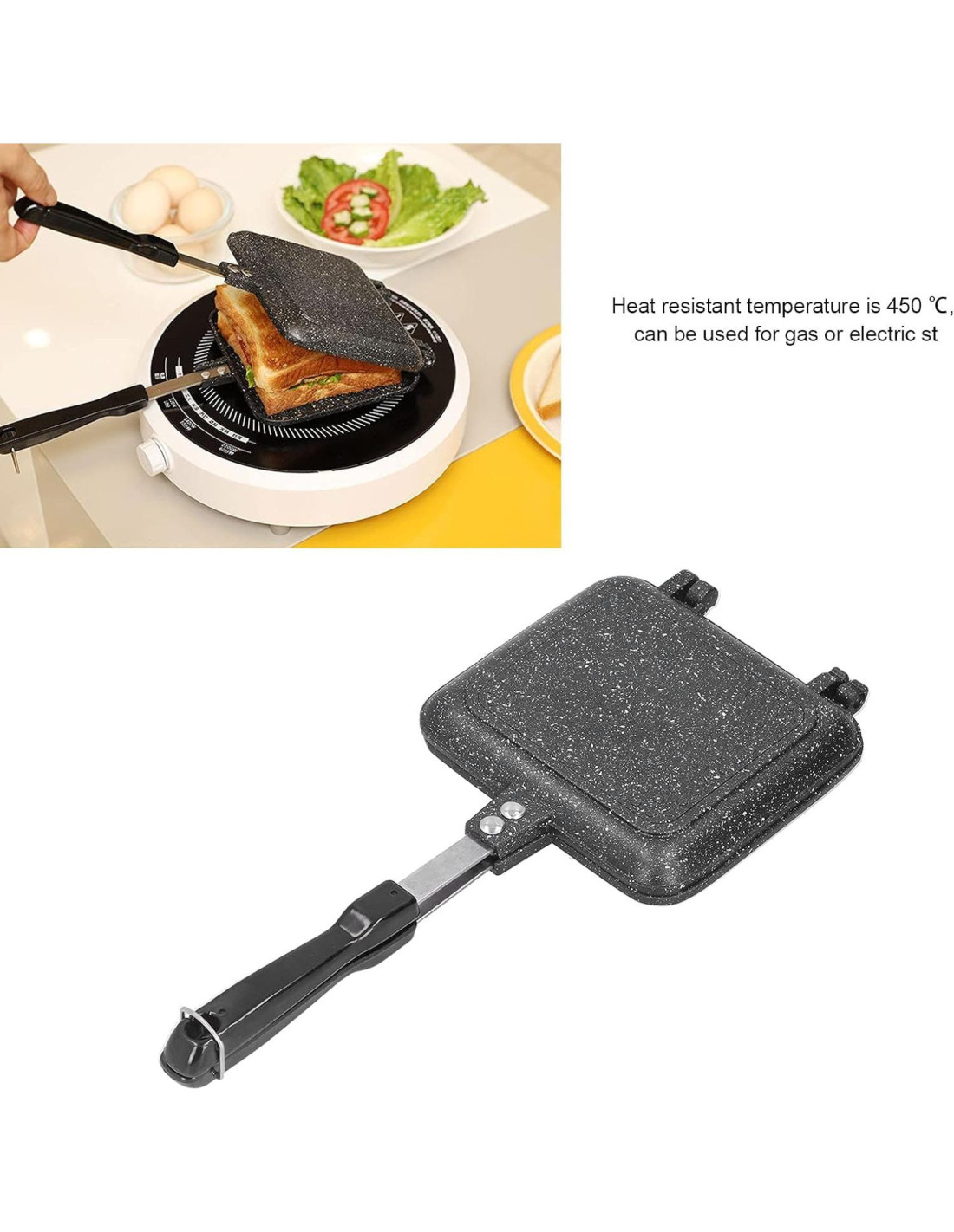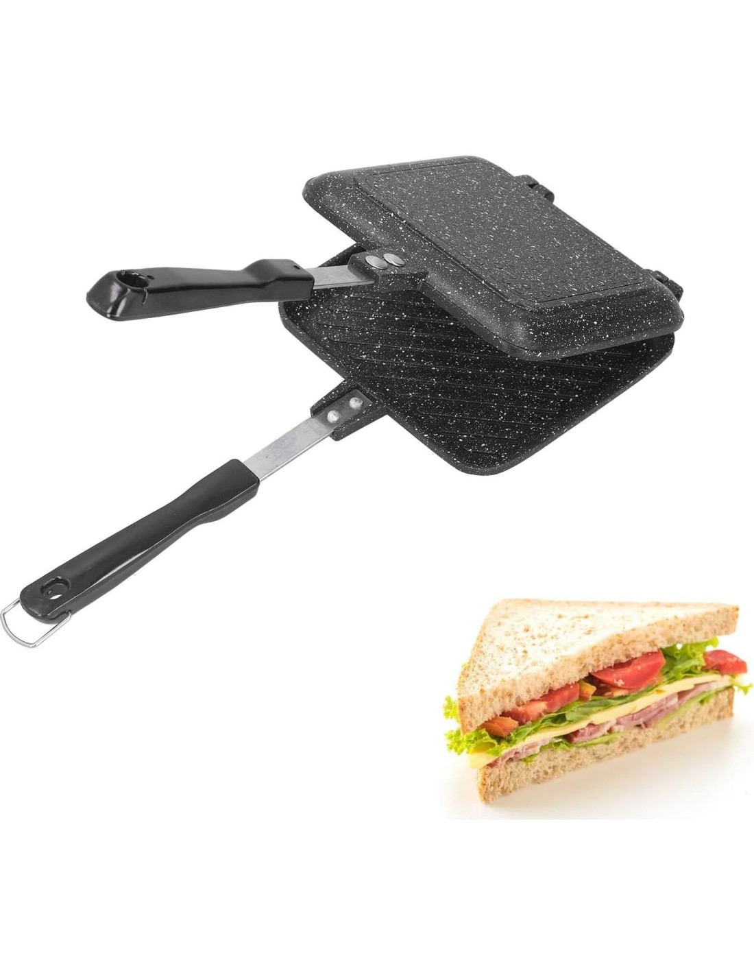 - FÁCIL DE USAR: Con mango anti-escaldaduras, la sartén de aluminio resistente al calor tiene una temperatura de 450 C, el fabricante de sándwiches antiadherente de doble lado se puede usar para estufas de gas o eléctricas o en picnics, la sartén para sándwiches es muy conveniente de usar