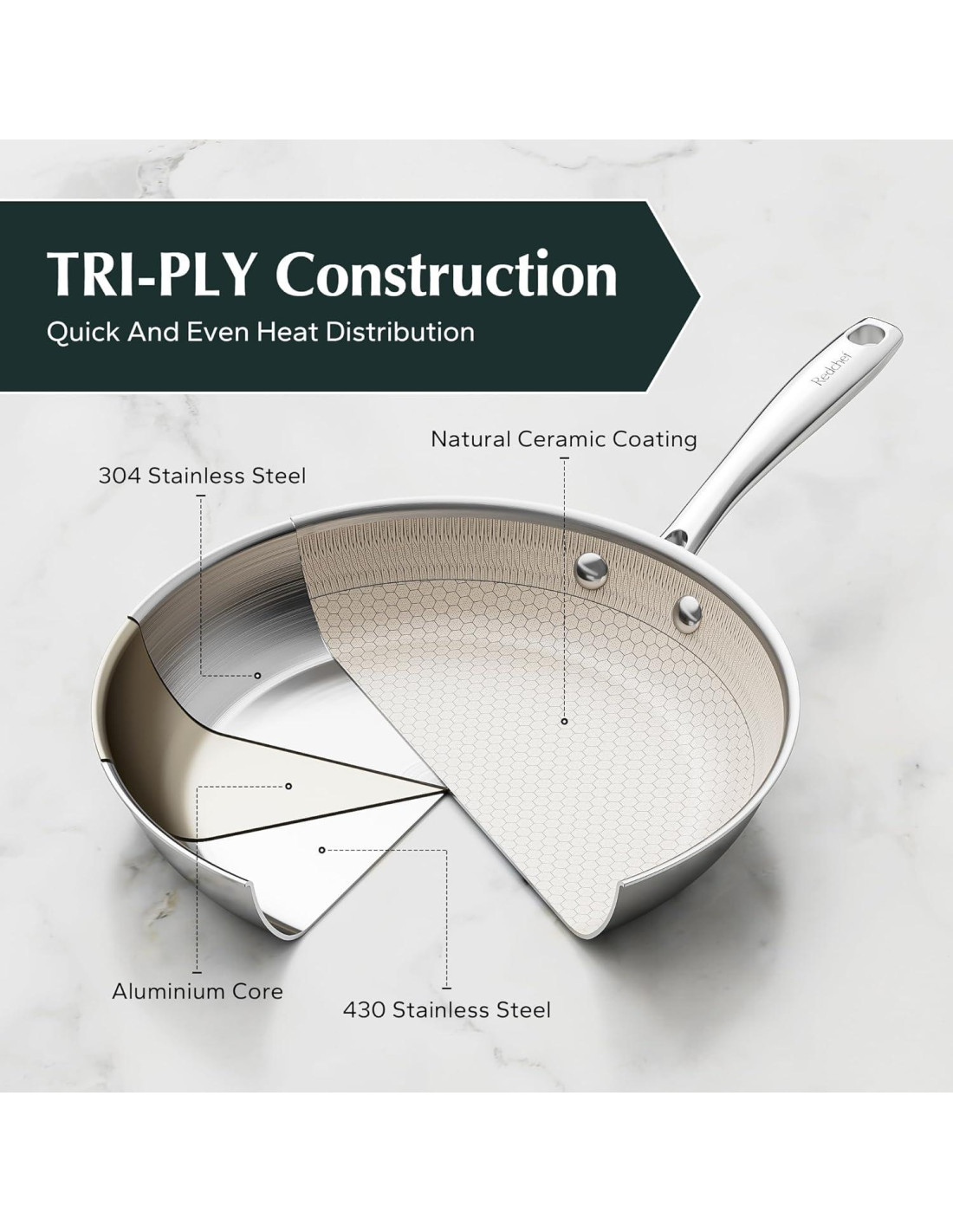 - Construcción de Tres Capas: Núcleo de aluminio construido para durar, intercalado entre dos capas de acero inoxidable para una distribución uniforme del calor y resultados de cocción profesionales