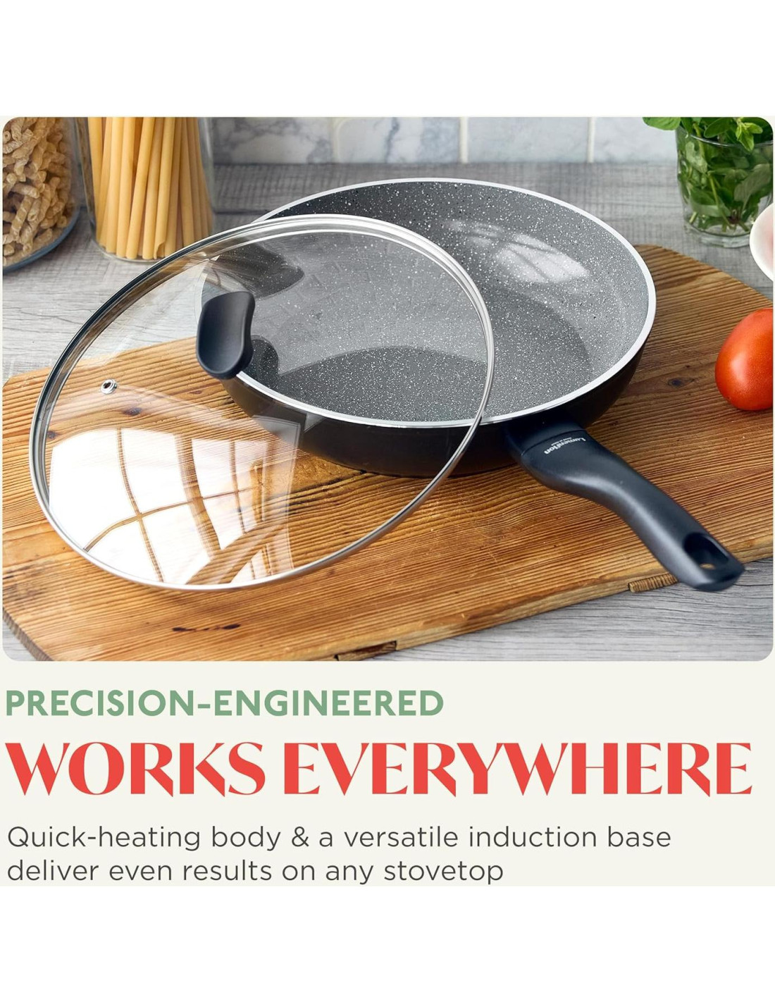 - Cerámica Antiadherente Libre de PFAS: Inspirada en la belleza volcánica de Italia, esta cerámica antiadherente en capas combina una superficie texturizada única con un acabado moteado para liberaciones sin esfuerzo y durabilidad duradera.