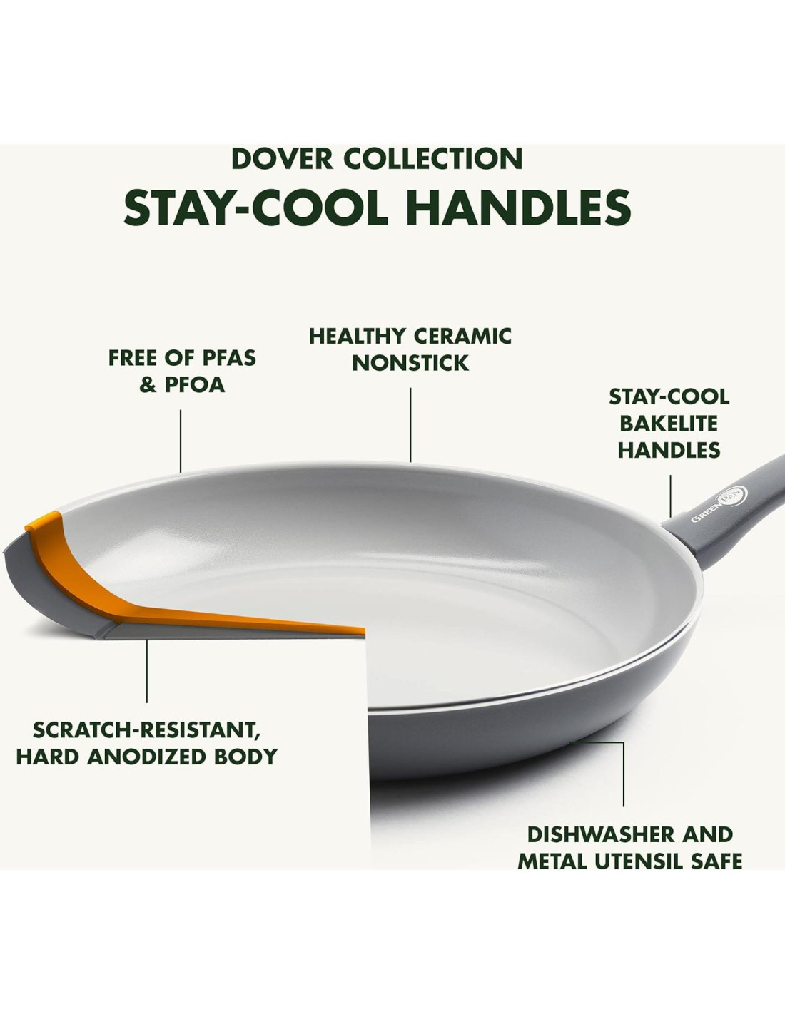 Experimenta comidas mejores, más rápidas y más saludables cuando cocinas con GreenPan Dover. Esta colección de alto rendimiento cuenta con el recubrimiento antiadherente de cerámica saludable característico de GreenPan, que está libre de PFAS, PFOA, plomo y cadmio, así que solo tienes que preocuparte por la comida. El interior sin remaches te ofrece una superficie sin enganches para cocinar tus alimentos favoritos, mientras que el mango que se mantiene fresco mantiene todo cómodo. Dover está fabricado de aluminio de calentamiento rápido, así que puedes comenzar a cocinar más rápido. Esta sartén versátil está lista para preparar los mejores revueltos, salteados de verduras, pescado frito y mucho más.