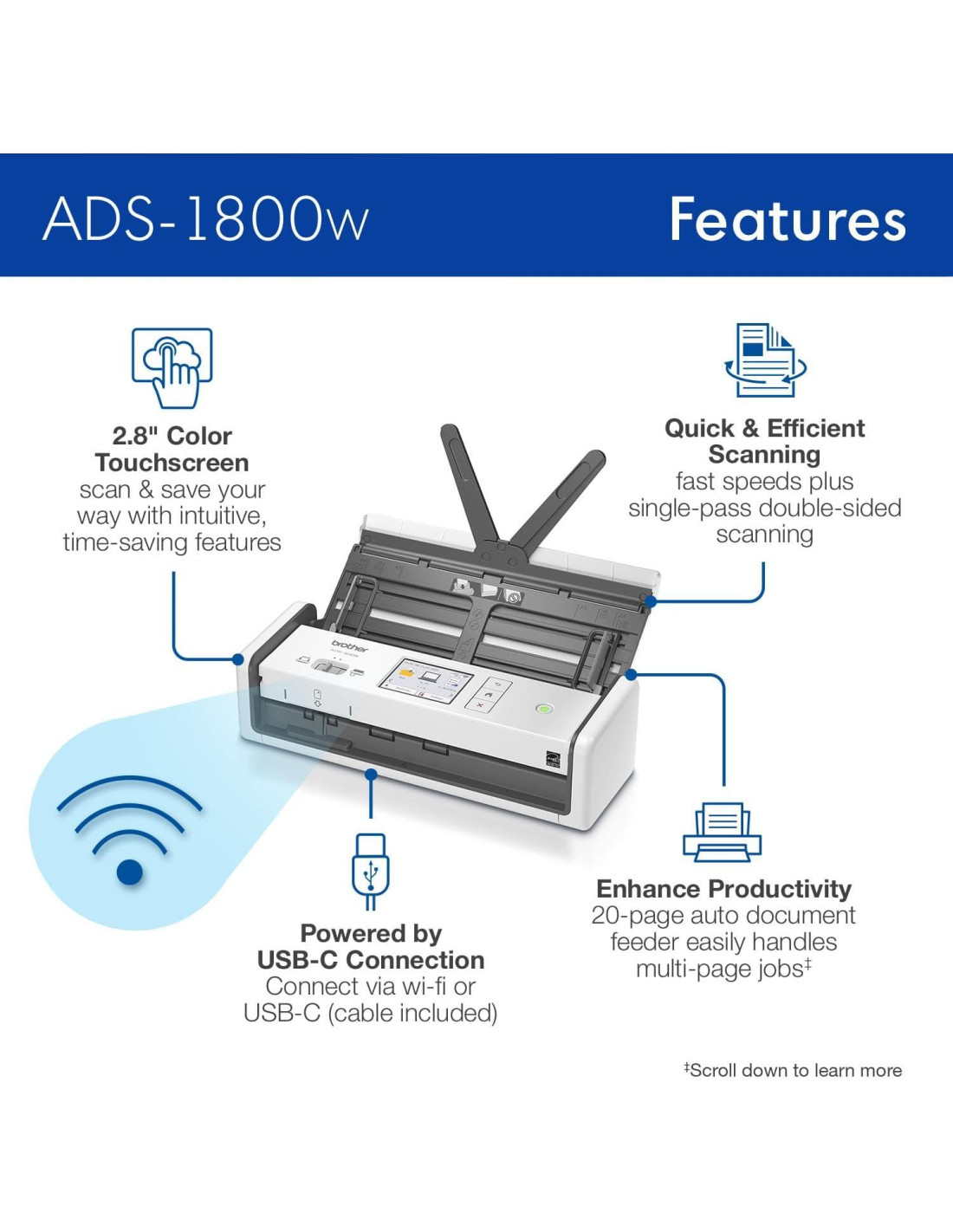 - Perfecto para una pequeña oficina o oficina en casa, el Brother ADS-1800W maneja grandes trabajos con facilidad, con velocidades de escaneo rápidas de hasta 30ppm, alimentador automático de documentos de 20 páginas, y capacidades de escaneo a doble cara en una sola pasada.