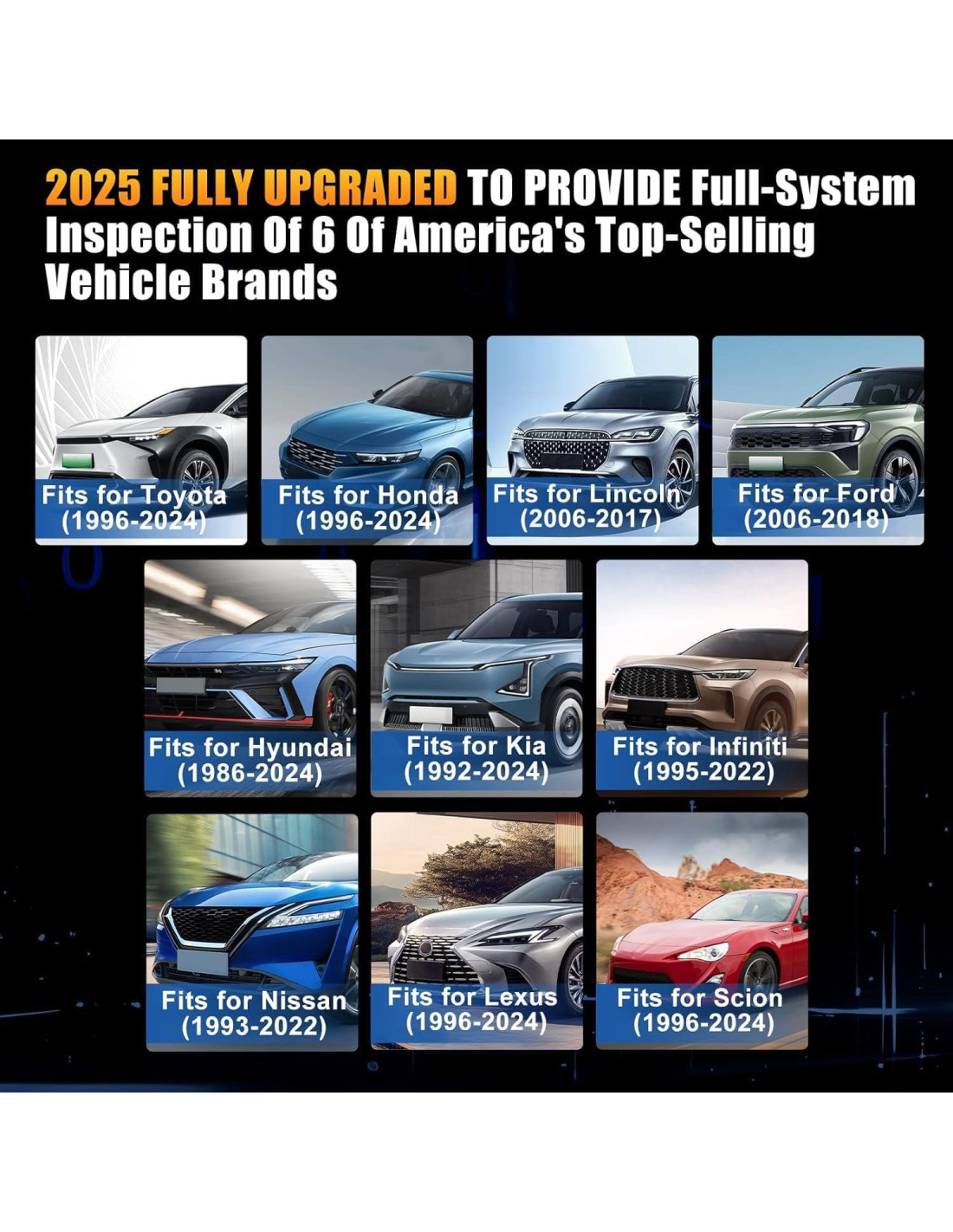 - Consejos y Soporte Los diagnósticos de sistema completo se aplican solo a Toyota, Honda/Acura y Ford/Lincoln; las funciones OBD2 están disponibles para todos los vehículos compatibles. Este escáner borra códigos después de reparaciones pero no realiza funciones de reinicio/servicio. Precargado con el software más reciente, no se necesitan actualizaciones. No dude en contactarnos para una rápida confirmación de compatibilidad o soporte técnico