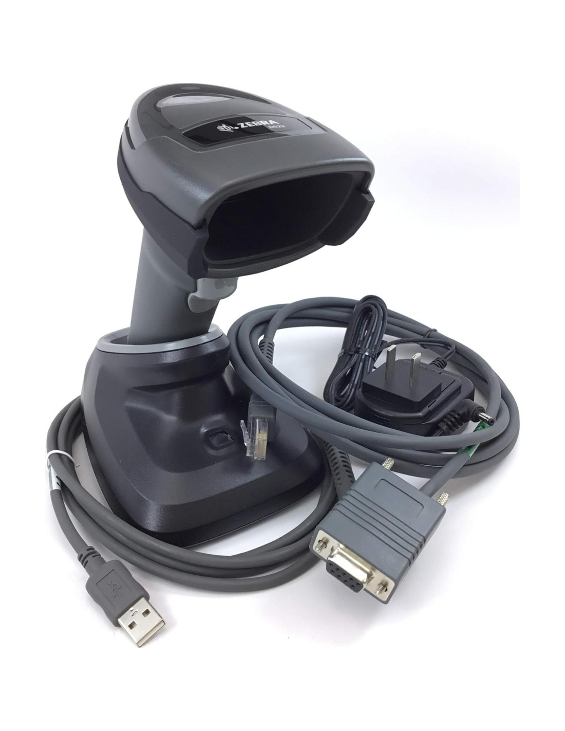 - El kit incluye un escáner de código de barras, una base, un adaptador de corriente, un cable RS232, un cable USB y un manual.
