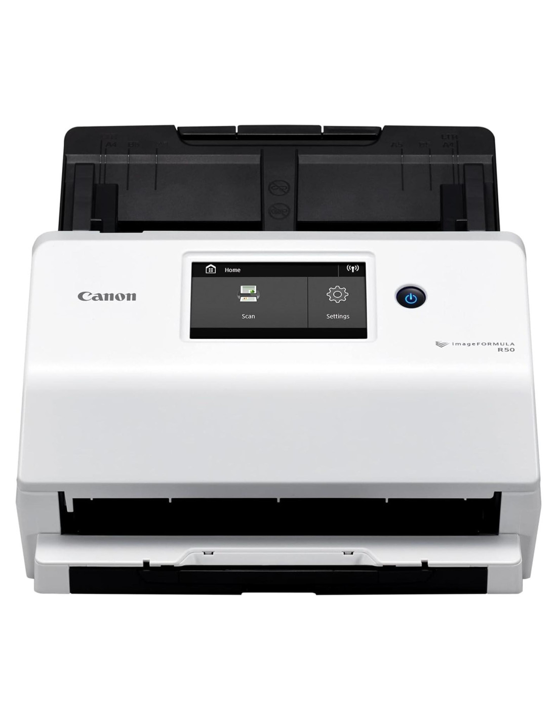 El escáner de documentos de oficina Canon imageFORMULA R50 con pantalla táctil a color es simple de configurar y fácil de usar. Conéctese a través de un cable USB o red Wi-Fi y convierta rápidamente documentos en papel a archivos digitales buscables.