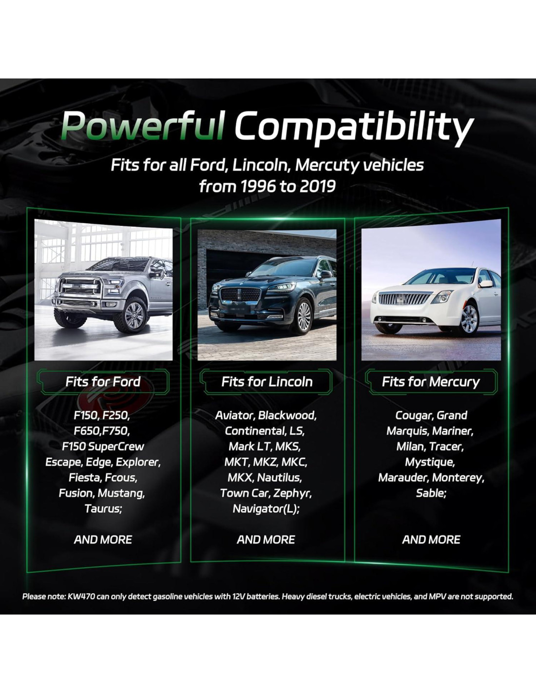 - Diseñado para la serie Ford Lincoln Mercury. El escáner OBD2 KW470 es compatible con Ford Lincoln Mercury. Tener un escáner OBD2 KW470 permite detectar problemas temprano para evitar reparaciones costosas. Este escáner de diagnóstico de automóvil puede resolver problemas del vehículo directamente, ahorrándote tiempo y dinero.