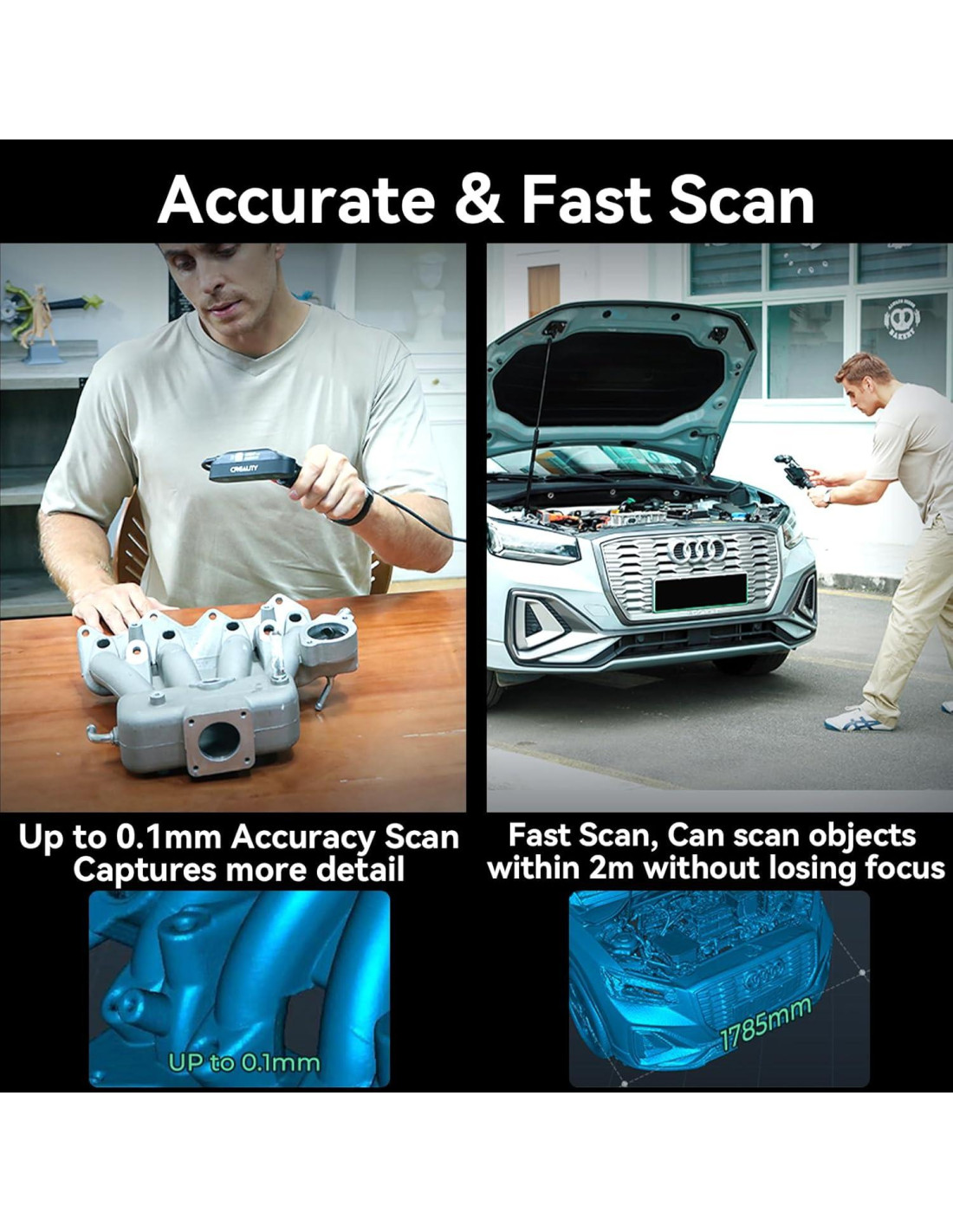- Alta calidad y escaneo rápido. La lente del escáner 3D Creality Ferret Pro tiene una precisión de hasta 0.1mm que asegura mejor precisión dimensional y captura más detalles. El chip ASlC específico de imagen 3D incorporado proporciona capacidad de computación, permite escaneo rápido para objetos medianos y grandes. También está equipado con puente inalámbrico WiFi6, utilizando la red inalámbrica de alta velocidad más avanzada WiFi6, 3 veces más rápido que WiFi5, asegura una recolección de datos más fluida al usar un teléfono celular.