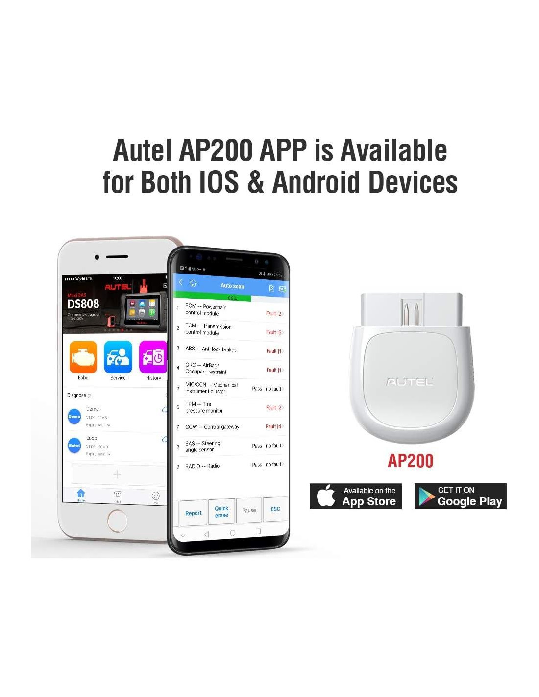 NO.1 Serie TPMS y Escáneres para tu elección. Es capaz de descargar y actualizar la APP de por vida sin costo adicional, cada actualización de la app asegurará que esté actualizada con los últimos vehículos, esto puede ayudar a extender la vida útil del AP200. Con un modelo soportado (disponible de por vida) como regalo, y necesitas hacer algunas compras dentro de la app para elegir una marca de vehículo extra (1 año de uso), si es necesario. Bluetooth es lo que quieres, porque deja el WiFi de tu tablet o teléfono disponible para conectarse simultáneamente a internet, y te mantiene desconectado del vehículo, mientras también te permite realizar el trabajo. Solo ten en cuenta que necesitas emparejar el lector de códigos AP200 a través de "Bluetooth" en la App Autel MaxiAP200, NO en la interfaz de configuración de dispositivos inteligentes. No necesitas preocuparte por la compatibilidad del vehículo, este escáner OBD2 Bluetooth está disponible para casi todos los vehículos OBDII compatibles de 1996 en adelante. Modelos de automóviles específicos incluyen GM, Ford, Benz, BMW, Land Rover, Skoda, Volvo, Smart, Audi, Bentley, Citron, Acura, Honda, Hyundai, Kia, Lexus, Mazda, Nissan, Toyota, Chrysler, Jeep, etc.