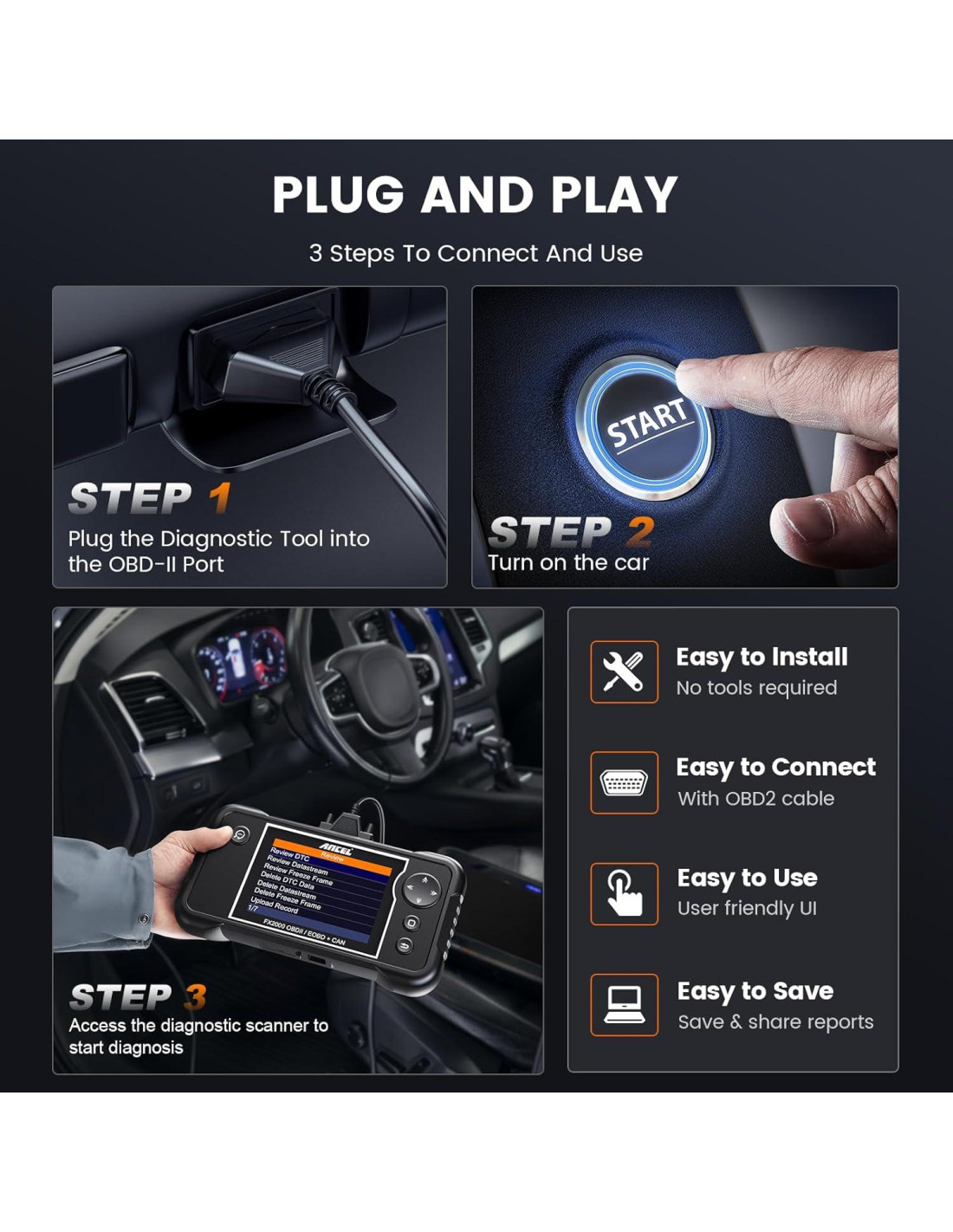- [ENCHUFA Y JUEGA - FÁCIL DE USAR] Obtén diagnósticos de coche sin complicaciones con la Herramienta de Diagnóstico OBD2 ANCEL FX2000-US. Esta herramienta práctica y versátil es fácil de usar y solo requiere 3 pasos simples para conectarse a tu coche para el diagnóstico, sin operaciones complicadas. Incluso los principiantes pueden usarla para leer datos y entender códigos de falla con facilidad. Además, este escáner OBD2 a un precio razonable puede ayudarte a determinar si tu coche está listo para su inspección anual a través del menú de preparación I/M, ahorrándote dinero y asegurando tu seguridad