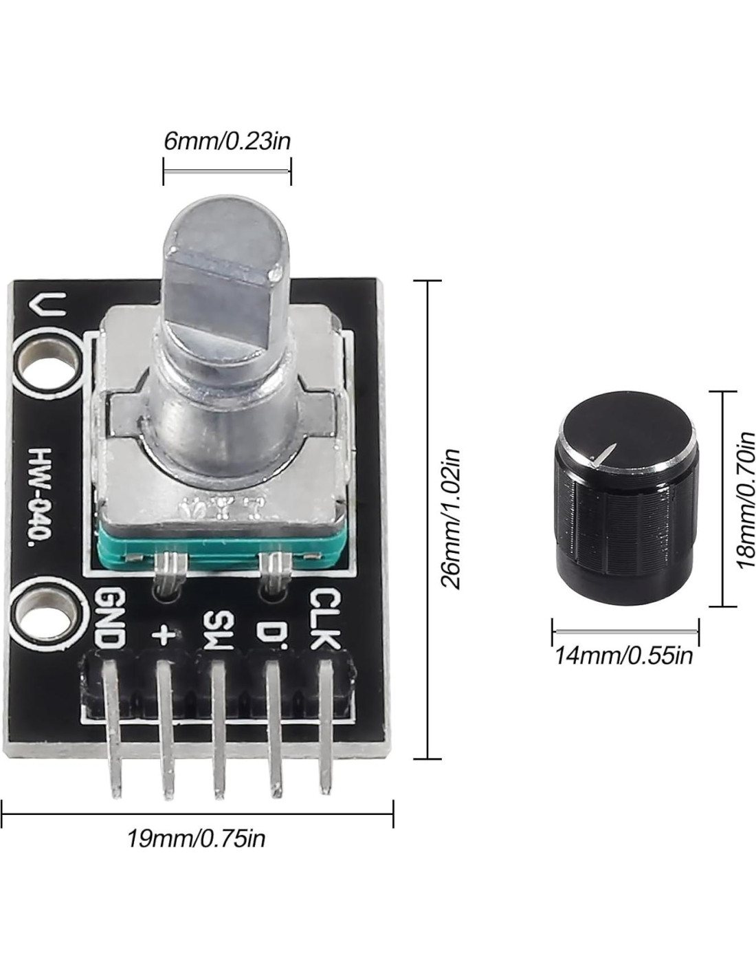 Características: Un Número Redondo de Pulsos: 20 Voltaje de Trabajo: 5V El codificador rotativo puede contar el número de pulsos de salida durante la rotación en la dirección positiva y en la dirección inversa a través de la rotación y estos conteos de rotación no están limitados. Con la tecla en el codificador rotativo, puedes restablecer al estado inicial, es decir, contar desde 0. El Material de la Tapa de la Perilla: aleación de aluminio La Especificación de la Tapa de la Perilla: diámetro: 15mm; altura: 16.5mm
