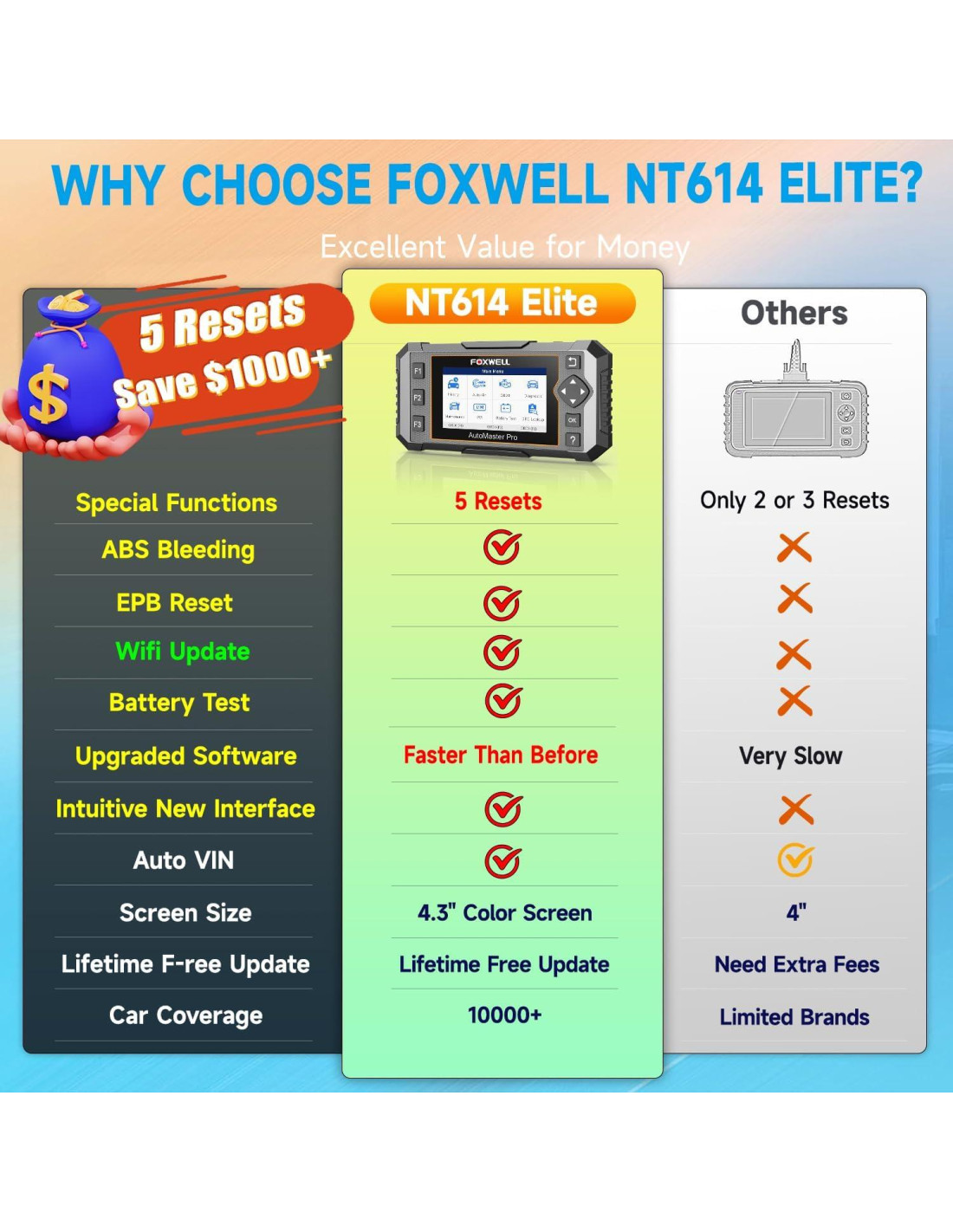 - Mejor relación calidad-precio - FOXWELL NT614 Elite (1) NOTA: NT614 Elite se actualizó a actualización WiFi y ya no requiere la molesta tarjeta Micro SD. Por lo tanto, la tarjeta SD ya no está incluida en el paquete. (2) Los nuevos modelos NT614 actualizados están pre-registrados, por lo que los clientes no necesitan registrarlos al recibirlos. Los productos pre-registrados también son completamente nuevos. (3) Visualización más intuitiva con nueva interfaz, puedes encontrar I/M, Prueba de Batería, Búsqueda de DTC directamente.