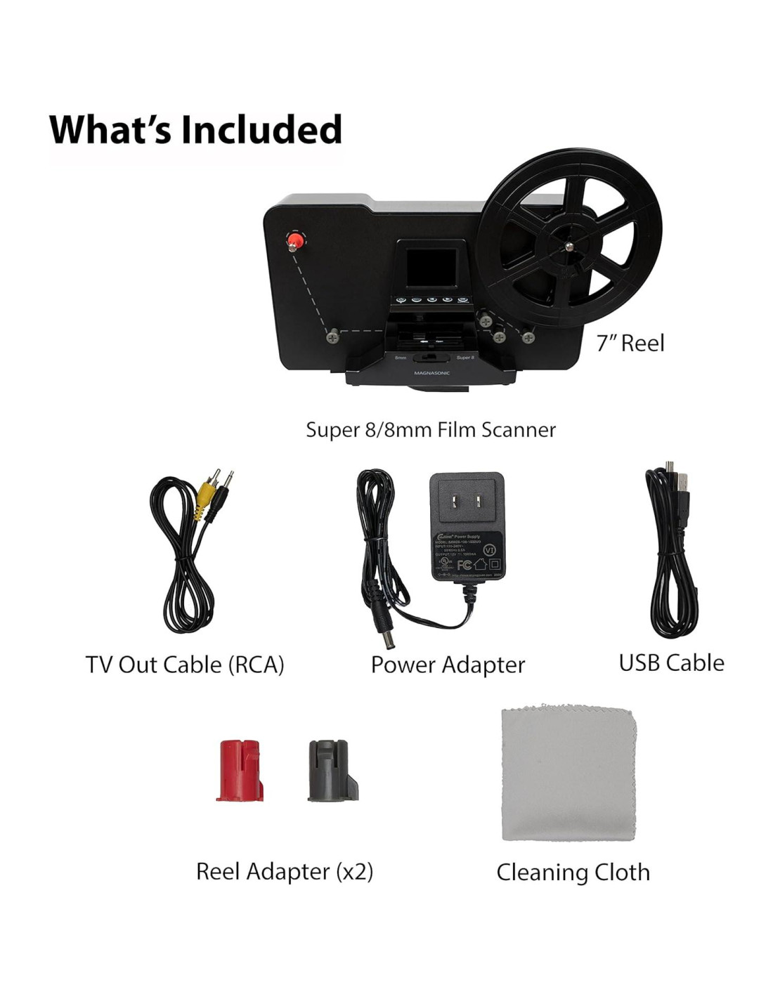 El Magnasonic FS81 es un escáner de película super 8/8mm a video que digitaliza películas antiguas en archivos digitales MP4. Escanea carretes de película de 3", 5" y 7" rápidamente y con facilidad. Visualiza mientras escaneas en la pantalla LCD integrada de 2.3 pulgadas (5.84 cm). Nota: Esto escanea video solamente, sin sonido. Simplemente monta tu carrete de película de 3, 5 o 7 pulgadas, elige tus configuraciones y comienza a escanear tu película super 8/8mm fotograma por fotograma. Escanea 15.24 metros de película en solo 30 minutos. Visualiza tu película escaneada directamente en la pantalla LCD vibrante de 2.3 pulgadas (5.84 cm). O lleva a tu familia y amigos por el camino de la memoria cuando visualices tus videos escaneados en tu televisor o monitor usando el cable RCA de salida de video incluido. Usa una tarjeta SD (no incluida) para guardar tus videos escaneados para que puedas descargar fácilmente tus archivos digitales a tu computadora a través del cable USB incluido. Comparte tus videos con la familia y cárgalos en un DVD para un regalo considerado para un ser querido. No se necesita software complicado de edición de video. Puedes ajustar la exposición, RGB, nitidez y encuadre directamente en el escáner de película super 8/8mm a video. Cuando estés listo, sube los archivos de video MP4 a tu computadora para visualización personal o para llevar a DVDs. Olvídate de ir a laboratorios fotográficos costosos para digitalizar tu película antigua. Este escáner es completamente automatizado, lo que lo hace muy simple de usar. Solo carga tu carrete, alimenta la película y presiona el botón de inicio. El escáner tira de la película automáticamente y escanea fotograma por fotograma para crear un archivo digital MP4 que se puede transferir fácilmente a tu computadora. FS81 Escáner de película Carrete de película Cable USB (152.4 cm) Adaptador de corriente (5V/1A) Cable RCA de salida de video (153.7 cm) Paño de limpieza Manual de instrucciones Pantalla LCD a color de 2.31" (5.87 cm) Enfoque fijo Automático/Manual (-2.0 EV ~ +2.0 EV) 1440 x 1080 3.5 Megapíxeles Grabación de video 2 fotogramas por segundo Carretes Super 8/8mm de 3", 5" y 7" (16mm - No) Inglés, Francés, Alemán, Italiano, Español, Japonés, Chino simplificado, Chino tradicional Retroiluminación LED MP4 20 fotogramas por segundo 20 fotogramas por segundo NTSC Ninguno Tarjeta de memoria SD de hasta 32GB (Clase 4 y superior) 100-240V CA (50/60Hz) 32.0 x 13.0 x 19.1 cm (LxWxH) 2.0 kg (4.4 lbs) Negro 061783270448