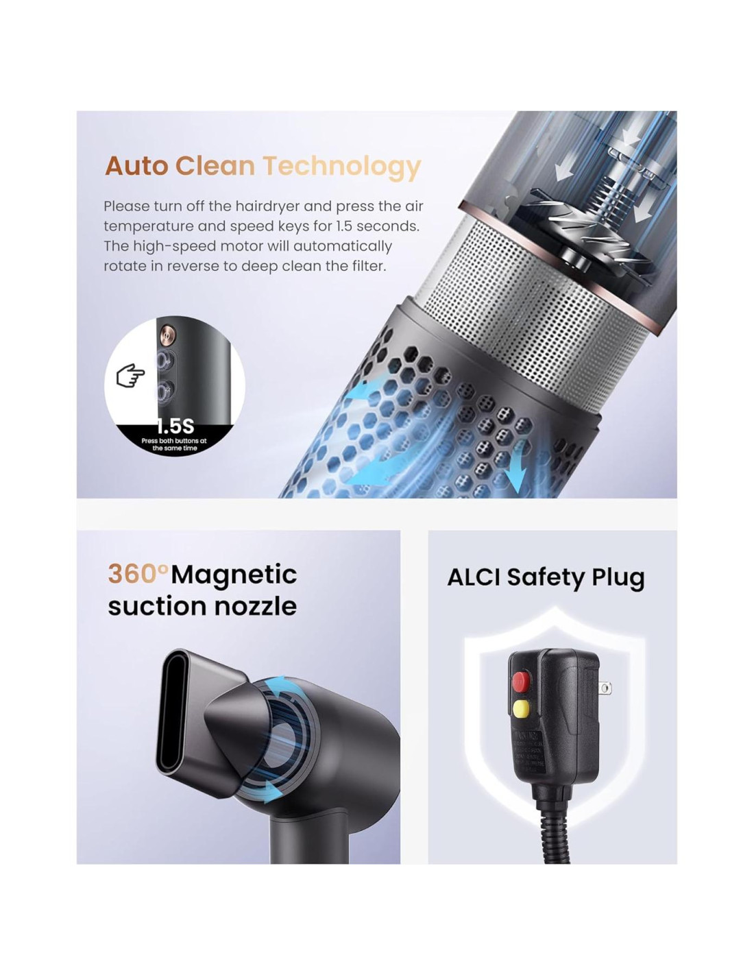 - Seguridad & Función de Limpieza Automática: Enchufe de seguridad ALCI estándar UL certificado que proporciona protección automática contra fugas y sobrecalentamiento. Malla filtrante de 0.2mm para prevenir que el cabello sea succionado. La función de autolimpieza simplifica las tareas de mantenimiento y extiende efectivamente la vida útil del secador de pelo.