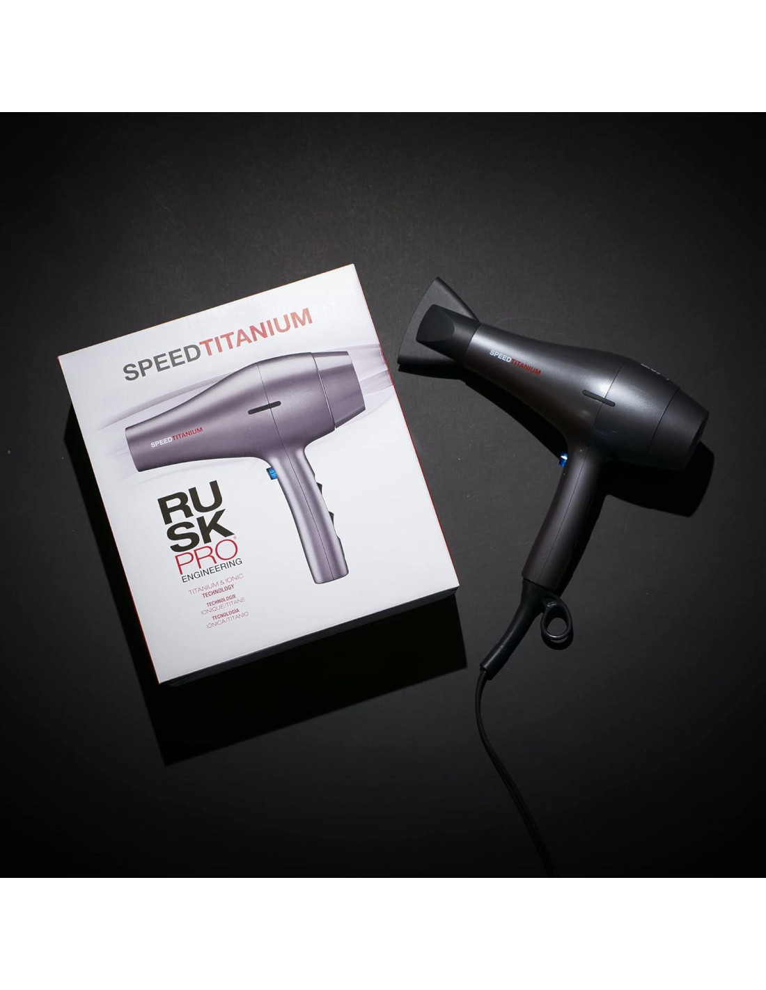 - SECADOR DE CABELLO RUSK PRO Speed Titanium - Generador Iónico Elimina Frizz, Potente Motor AC con 6 Velocidades y Configuraciones de Calor para Estilizado Rápido, Además de Difusor y Concentrador para Estilos Únicos