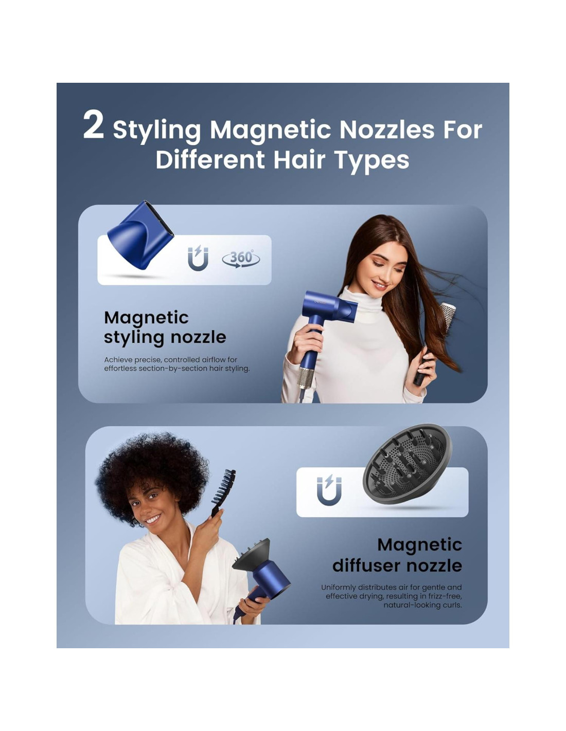 - Accesorios Magnéticos: Viene con un difusor de succión magnética para mayor volumen y definición de rizos y una boquilla magnética de 360 para un control preciso del flujo de aire. Ambos accesorios se colocan fácilmente, proporcionando versatilidad y facilidad de uso para cualquier estilo.