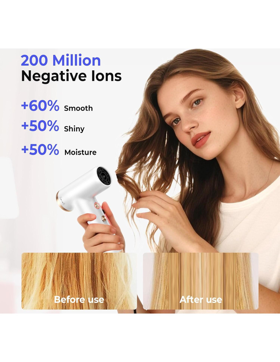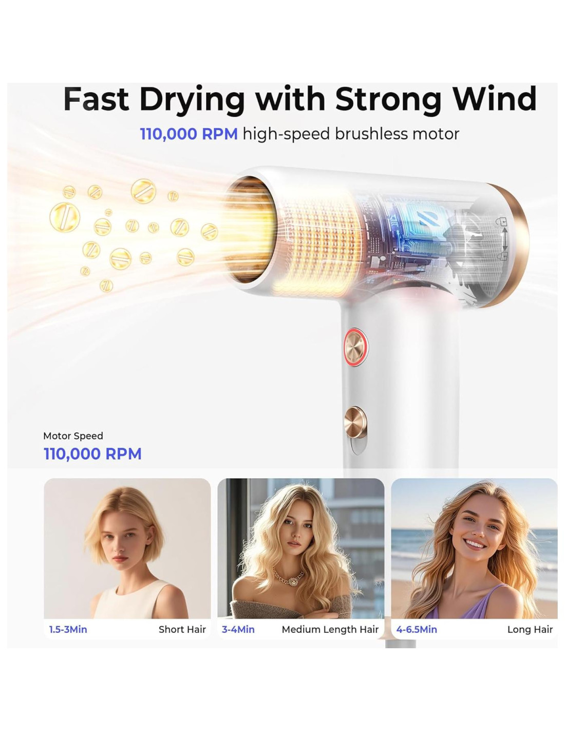 - Potencia de Secado de Grado de Salón, Aprovechando un motor profesional de 110,000 RPM, nuestro secador de pelo mini emite un intenso flujo de aire para secar incluso el cabello grueso y largo en aproximadamente 6 minutos. Experimenta una velocidad digna de salón sin compromisos, ya sea que estés peinando rizos o domando el frizz, el secador de viaje ofrece un rendimiento constante y potente para todo tipo de cabello mientras ahorra tiempo valioso.