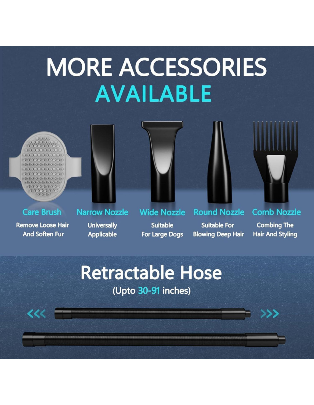 - [Diseño Amigable para Mascotas] Con una carcasa de ABS duradera de una sola pieza y tecnología avanzada de reducción de ruido, este secador para mascotas opera a solo 50-70 dB, 15 dB más silencioso que los secadores estándar. El diseño de bajo ruido mantiene a las mascotas ansiosas calmadas, lo que lo hace perfecto para animales sensibles. Además, la manguera flexible se extiende hasta 8.2 ft (2.5 m) para un cuidado seguro y sin complicaciones.