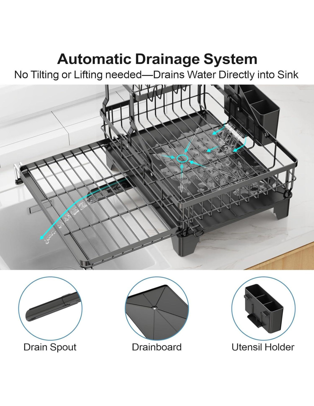 - Drenaje Sin Esfuerzo y Base Elevada: El agua fluye suavemente hacia el fregadero a través de un desagüe de 360 grados; Las patas elevadas evitan el estancamiento incluso en bordes irregulares; El soporte para utensilios drena directamente en el estante manteniendo las encimeras secas.