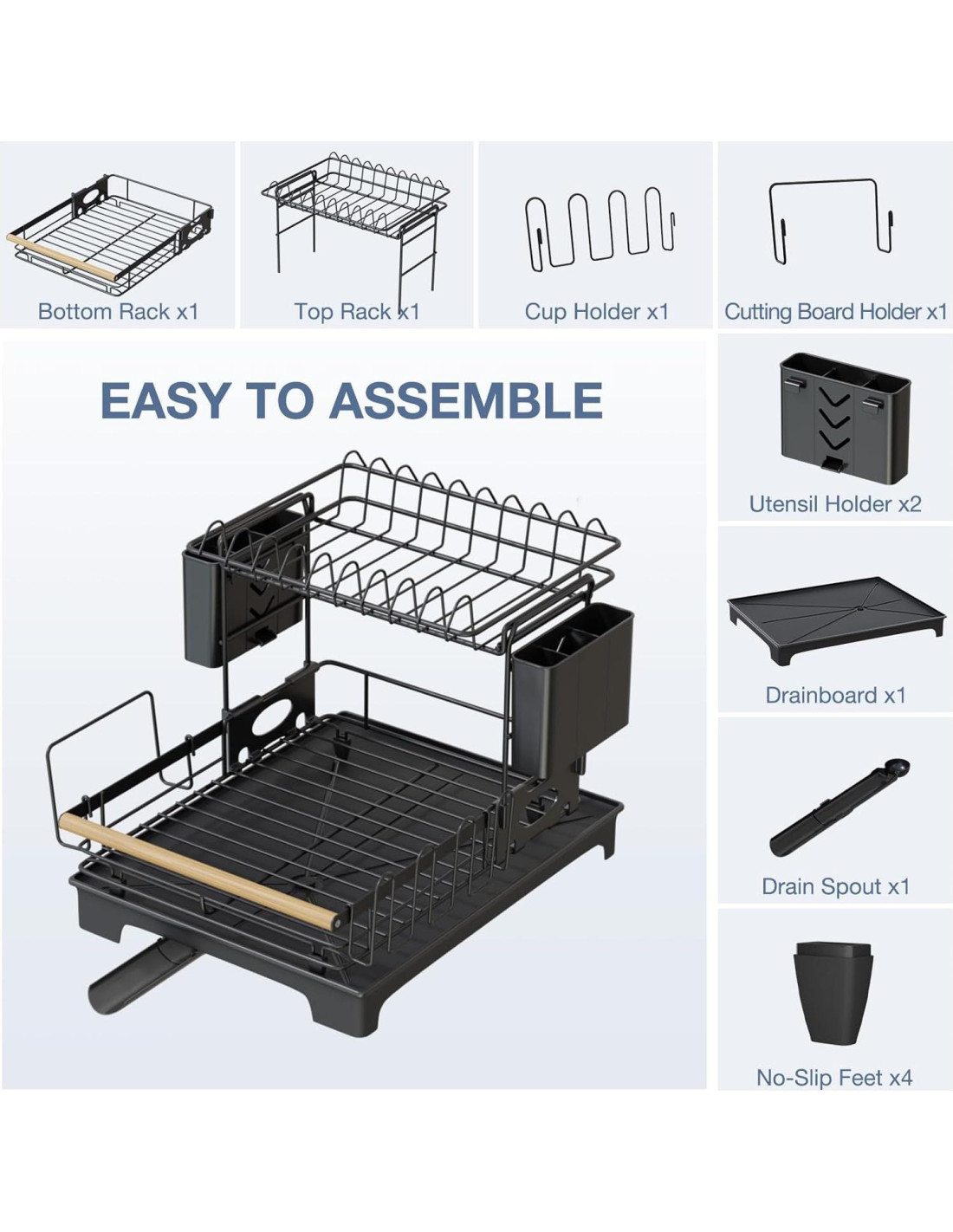 - Fácil de Montar y Ahorra Espacio: Nuestro organizador de platos de cocina viene empaquetado con dos escurridores de platos, bandeja de drenaje, soporte para utensilios de 3 ranuras, soporte para tabla de cortar, soporte para tazas y tubo de drenaje retráctil. Solo tomó unos minutos montarlo todo, no se necesitan herramientas adicionales. Este escurridor de platos para encimera de cocina es pequeño en tamaño, lo que puede ahorrar perfectamente espacio en tu encimera de cocina.
