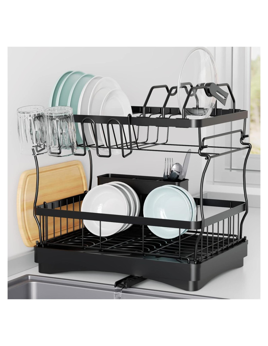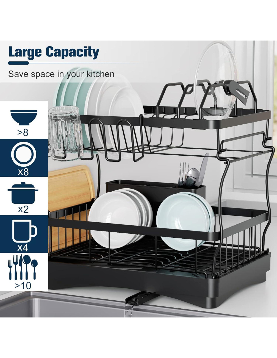 - [Alta Capacidad y Ahorro de Espacio] El estante para secar platos Aonee cuenta con un diseño desmontable de 2 niveles, proporcionando amplio almacenamiento para una variedad de utensilios de cocina, incluyendo copas de vino, tazones, platos, cuchillos, ollas y sartenes, mientras ahorra valioso espacio en la encimera y mantiene su mostrador organizado.