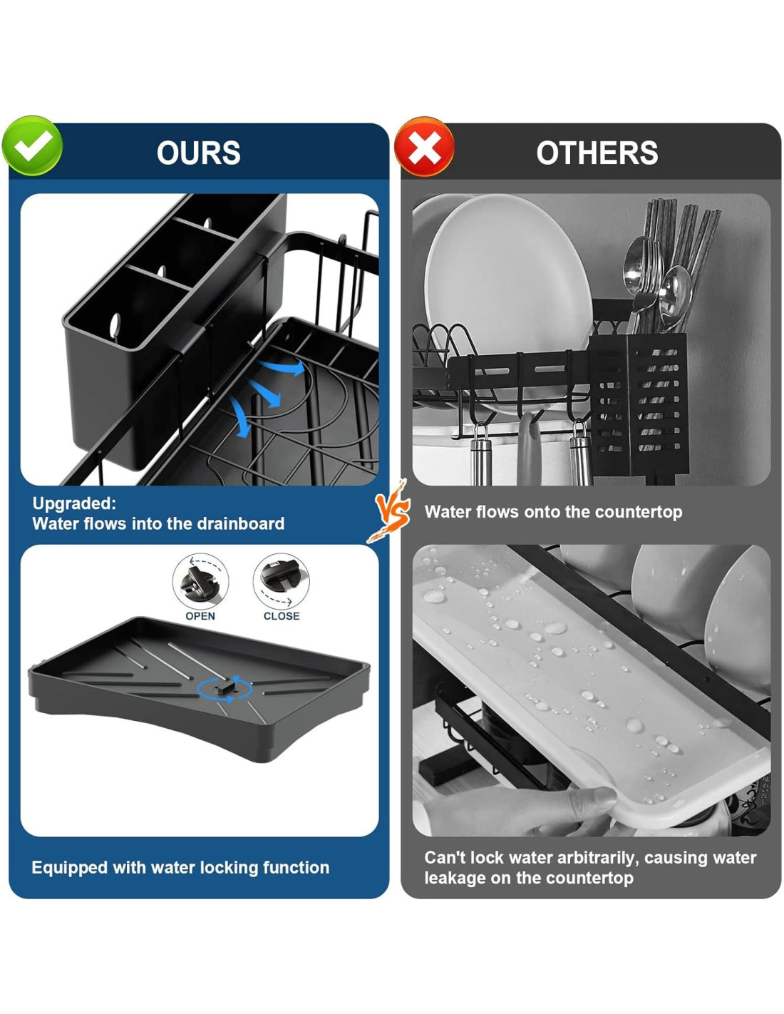 - [Drenaje Mejorado] Equipado con una bandeja de drenaje removible y un pico giratorio extensible de 270, el estante para secar canaliza rápidamente el exceso de agua hacia el fregadero. Con un conveniente botón giratorio en la bandeja de drenaje, puede controlar fácilmente el drenaje de agua y prevenir el agua estancada en la encimera.
