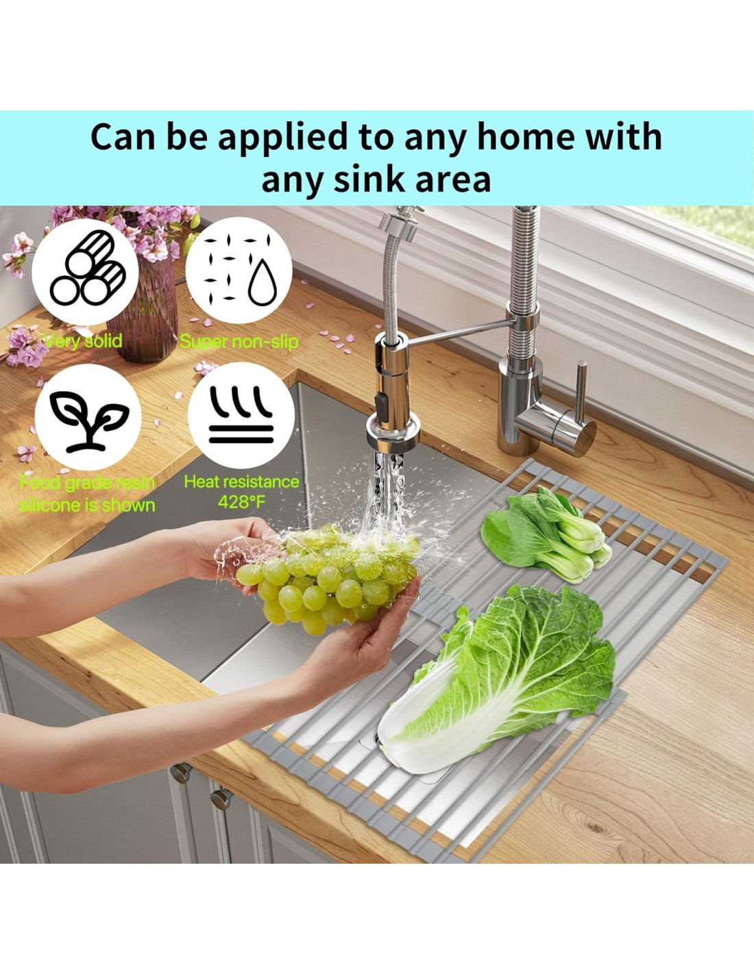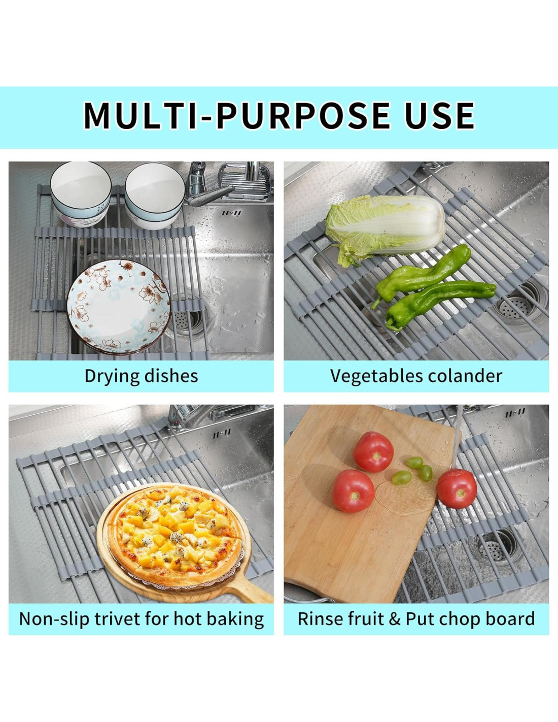 - Duradero. Escurridor para la parte superior del fregadero. Hecho de varillas de acero inoxidable de alta calidad y empaquetado de silicona de grado alimenticio, capacidad de carga máxima de hasta 10 kg, resistencia al calor de hasta 204C, el escurridor enrollable es mucho más fuerte que el escurridor de acero, a prueba de óxido, resistencia a la corrosión, antideslizante. Colocar platos, tazas y otros artículos sobre él no producirá sonido de colisión, no se deslizará y puede ser seguro. Se utiliza para frutas, verduras, pasteles, carne, etc.