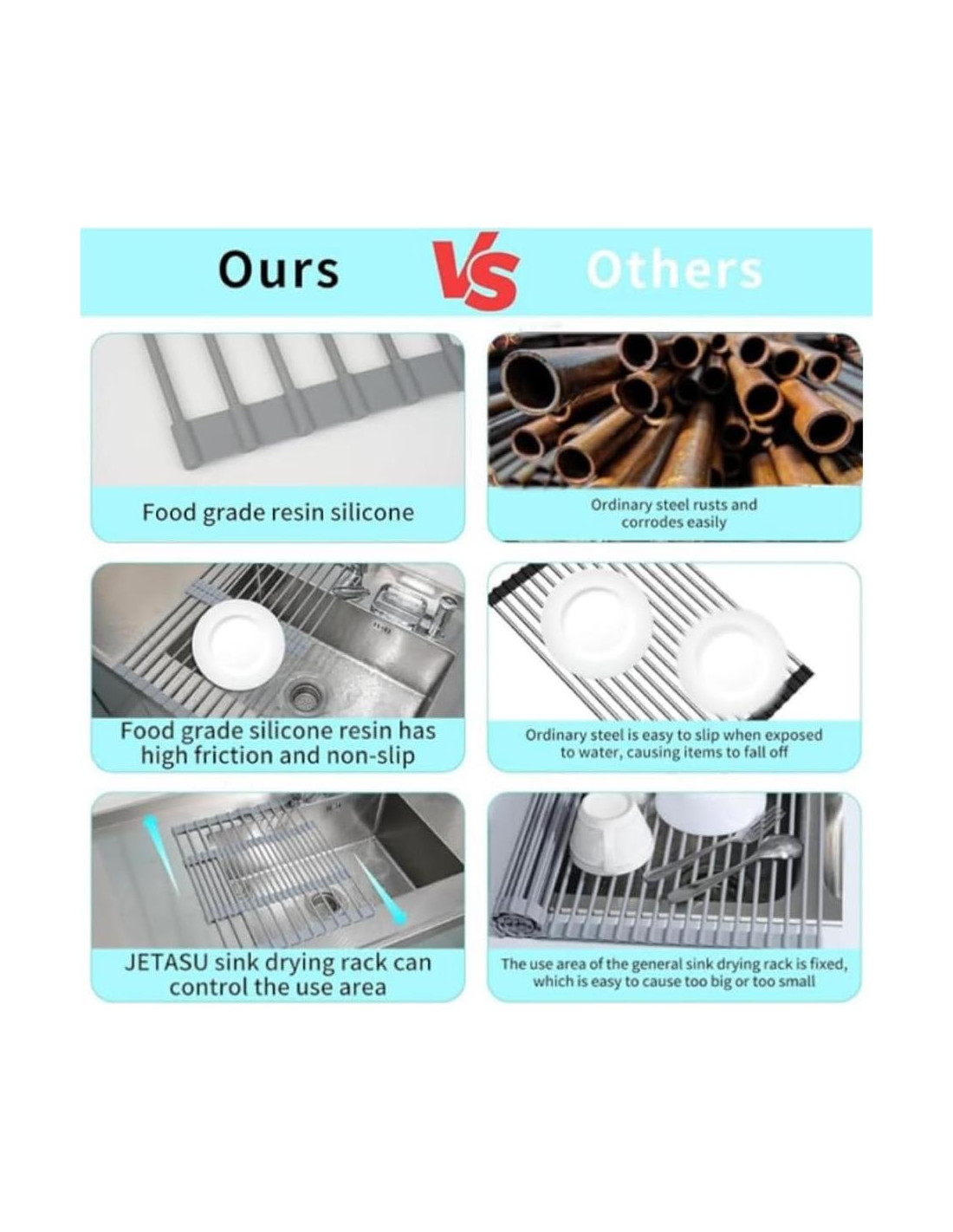 - Ahorro de espacio y fácil almacenamiento. El diseño perfecto del escurridor de platos plegable JETASU realmente funciona bien, no necesita ser instalado, puede ayudar a liberar espacio en la encimera, guardado en el armario o cajón cuando no está en uso. Si eres un amante de las casas rodantes, entonces el escurridor de platos JETASU sobre el fregadero ayudará aún más a tu casa rodante.