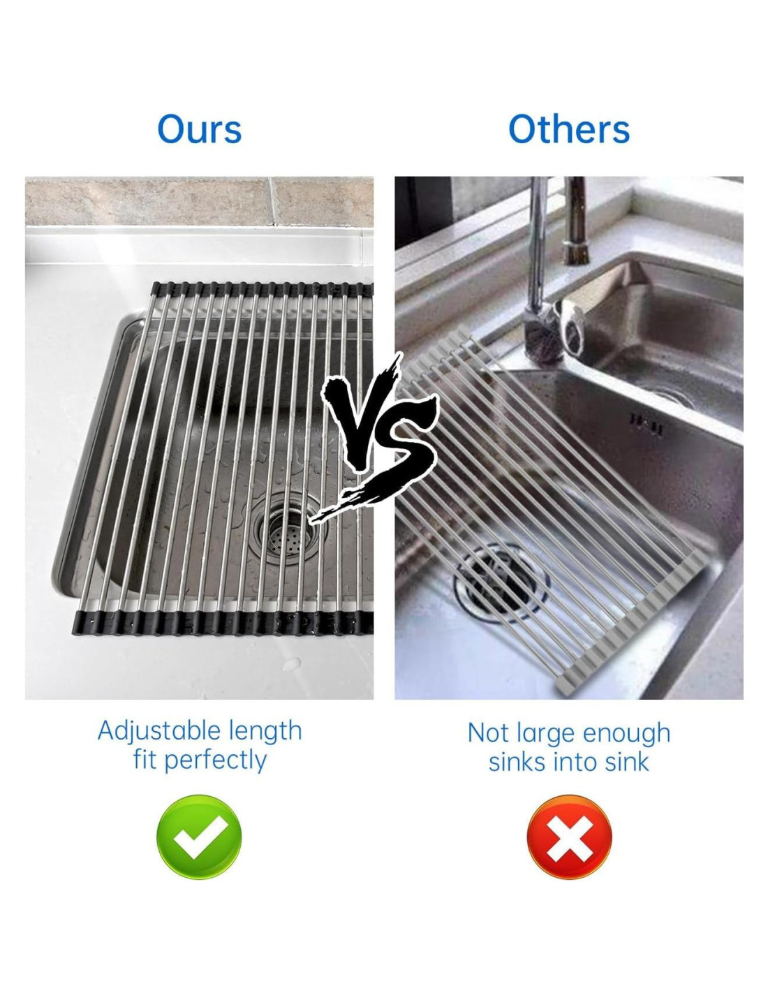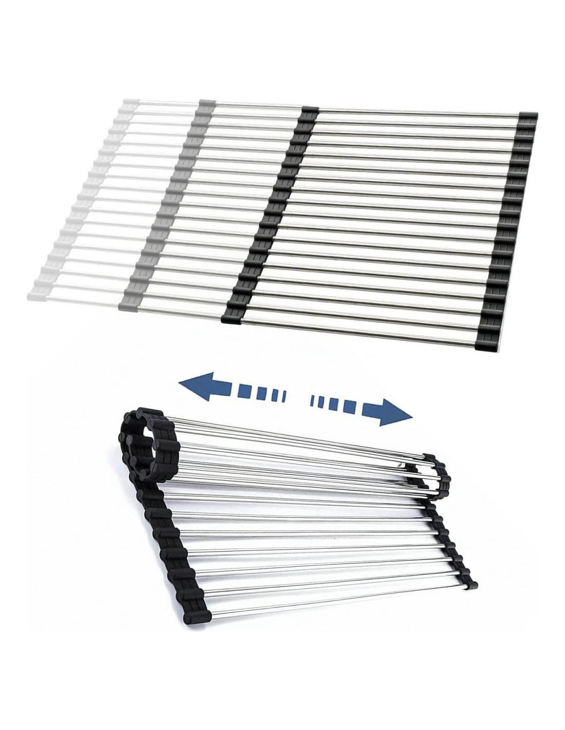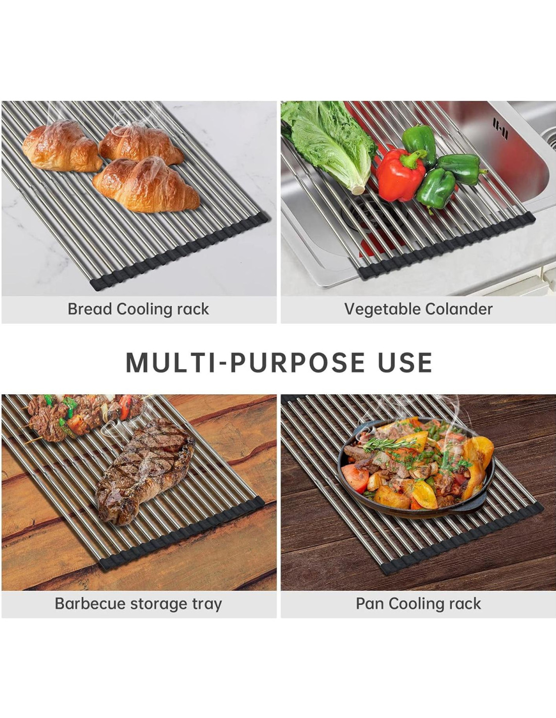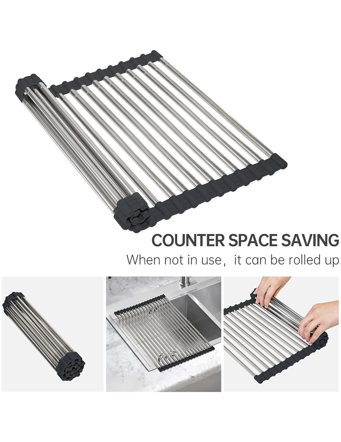 - Escurridor de fregadero enrollable multipropósito: Se puede usar sobre el fregadero o en la encimera de la cocina. Frutas, verduras, tazones, platos, tazas, sartenes lavadas se pueden secar en este escurridor. También puede enfriar tus productos horneados. Este escurridor de platos sobre el fregadero mantiene tus encimeras de cocina siempre secas. También se puede desmontar y colocar en el grifo para su uso. El escurridor de platos enrollable incluso se puede cortar por la mitad con tijeras para su uso.