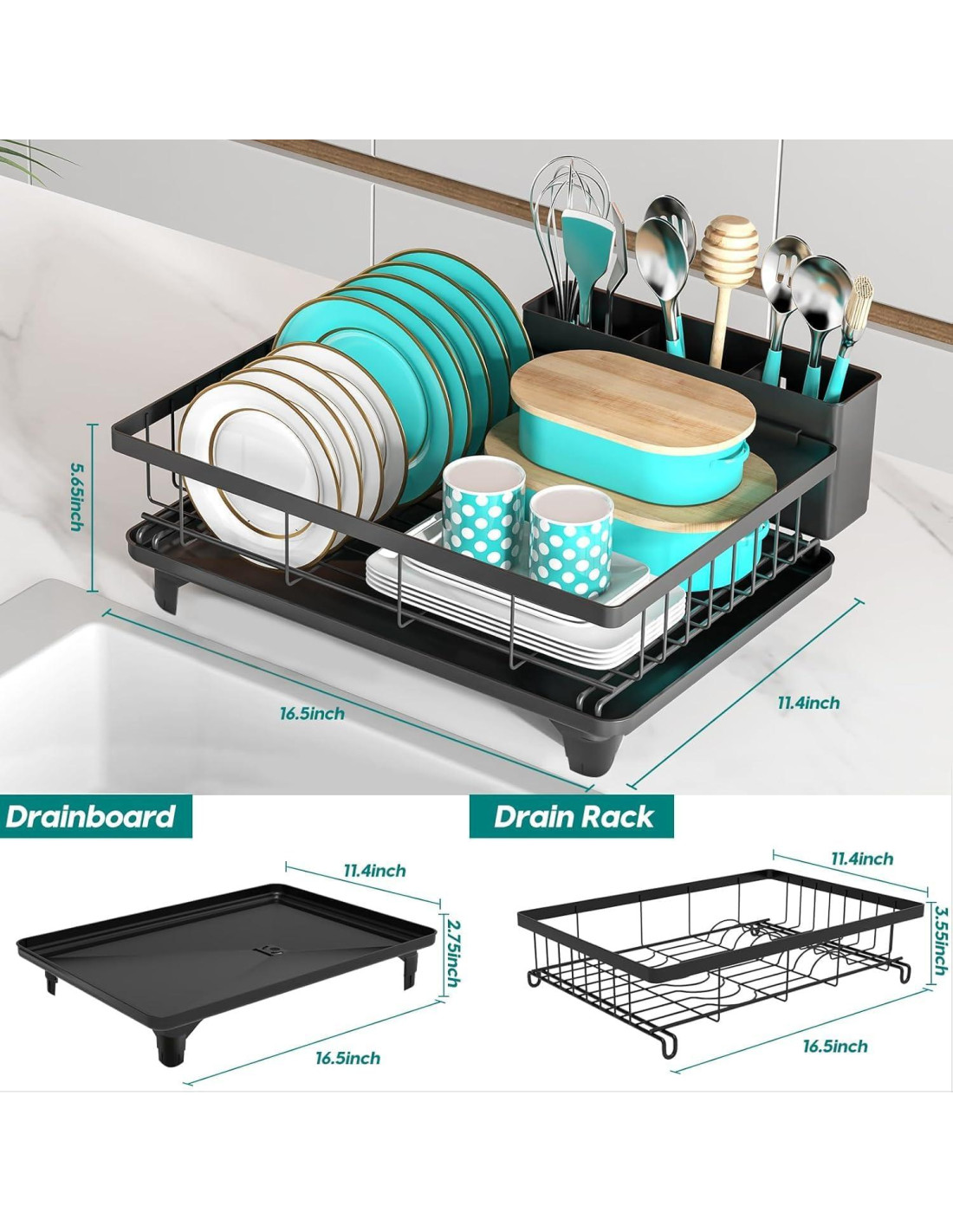 - [Funciona Genial] Estante para secar platos de encimera bien diseñado para sostener muchas cosas. El estante para secar platos de cocina duradero sobre el fregadero funciona bien y el estante sostiene platos y tazones de manera segura. El estante para platos estrecho es relativamente compacto, y no ocupa mucho espacio en la encimera y nunca necesita un tapete que se empape y huela mal. Este estante para secar platos de acero pequeño con la cesta de cubiertos desmontable y la ausencia de rincones y grietas. ¡Estarás muy feliz con esta compra!