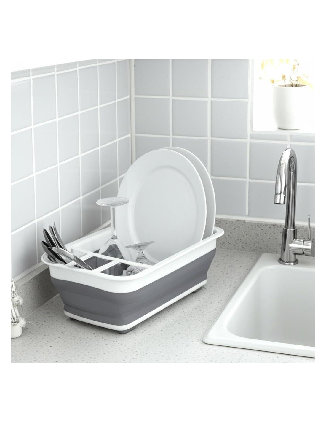 - Perfecto para almacenar y drenar vajilla y cristalería, este estante de secado de platos ajustable y plegable ofrece áreas de almacenamiento separadas para utensilios, gadgets y un estante de secado de utensilios incorporado con 4 compartimentos para organizar artículos pequeños como cuchillos, tenedores y cucharas. Está diseñado para ahorrar espacio, ideal para cocinas compactas, y puede expandirse o colapsarse para un fácil almacenamiento.